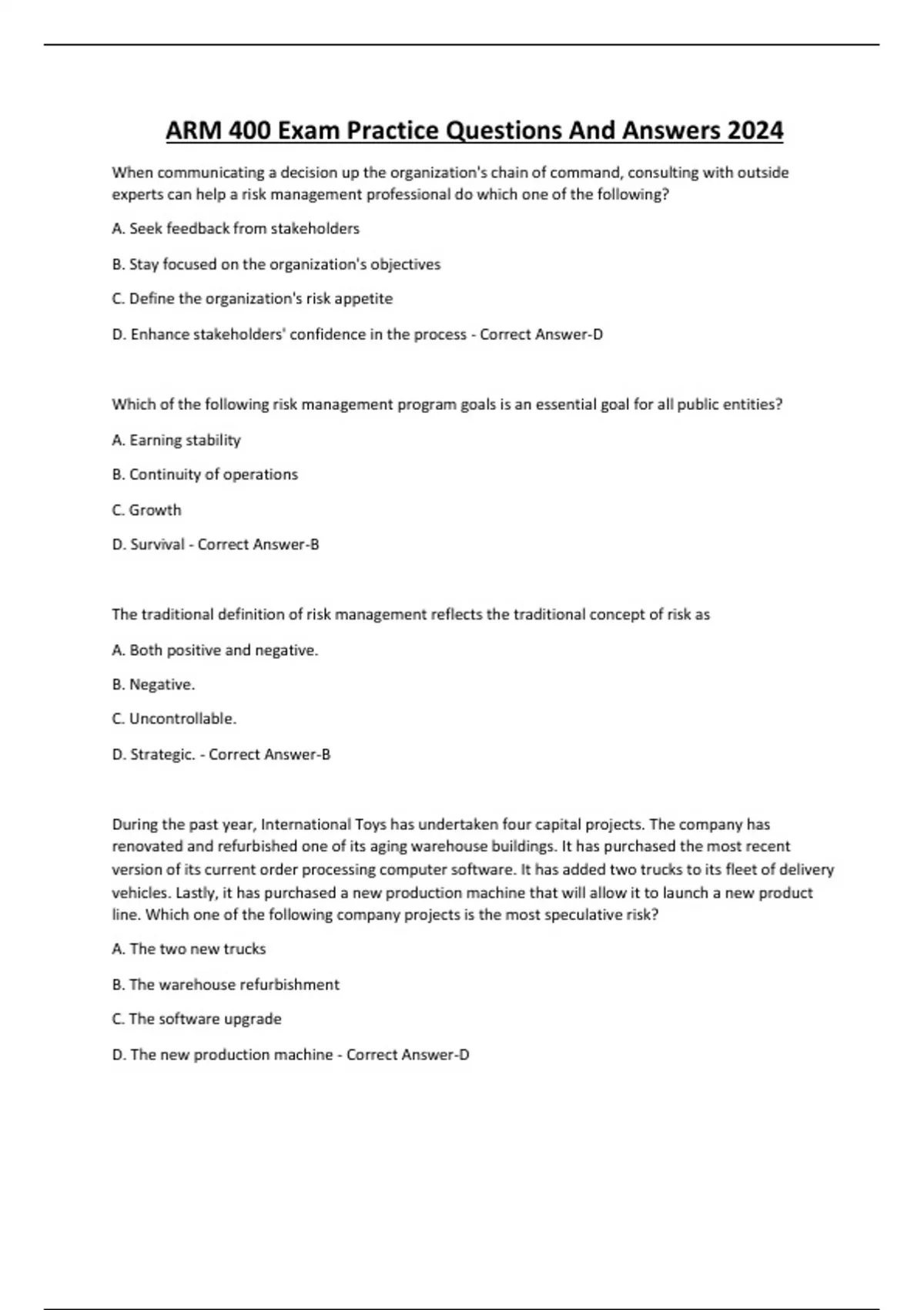 ARM 400 Exam Practice Questions And Answers 2024 When communicating a decision up the organization's chain of command, consulting with outside experts can help a risk management professional do which one of the following? A. Seek feedback from stakeholders B. Stay focused on the organization's objectives C. Define the organization's risk appetite D. Enhance stakeholders' confidence in the process - Correct Answer-D Which of the following risk management program goals is an essential goal for all public entities? A. Earning stability B. Continuity of operations C. Growth D. Survival - Correct Answer-B The traditional definition of risk management reflects the traditional concept of risk as A. Both positive and negative. B. Negative. C. Uncontrollable. D. Strategic. - Correct Answer-B During the past year, International Toys has undertaken four capital projects. The company has renovated and refurbished one of its aging warehouse buildings. It has purchased the most recent version of its current order processing computer software. It has added two trucks to its fleet of delivery vehicles. Lastly, it has purchased a new production machine that will allow it to launch a new product line. Which one of the following company projects is the most speculative risk? A. The two new trucks B. The warehouse refurbishment C. The software upgrade D. The new production machine - Correct Answer-D Which one of the following statements is true regarding the basic measures that apply to risk management? A. Consequences measure the degree to which an occurrence could positively or negatively affect an organization. B. Hedging is a risk management strategy that can reduce the risk of correlation. C. Risk increases as volatility decreases. D. Longer time horizons are generally less risky that shorter ones. - Correct Answer-A Which one of the following provides a measure of the maximum potential damage associated with an occurrence?