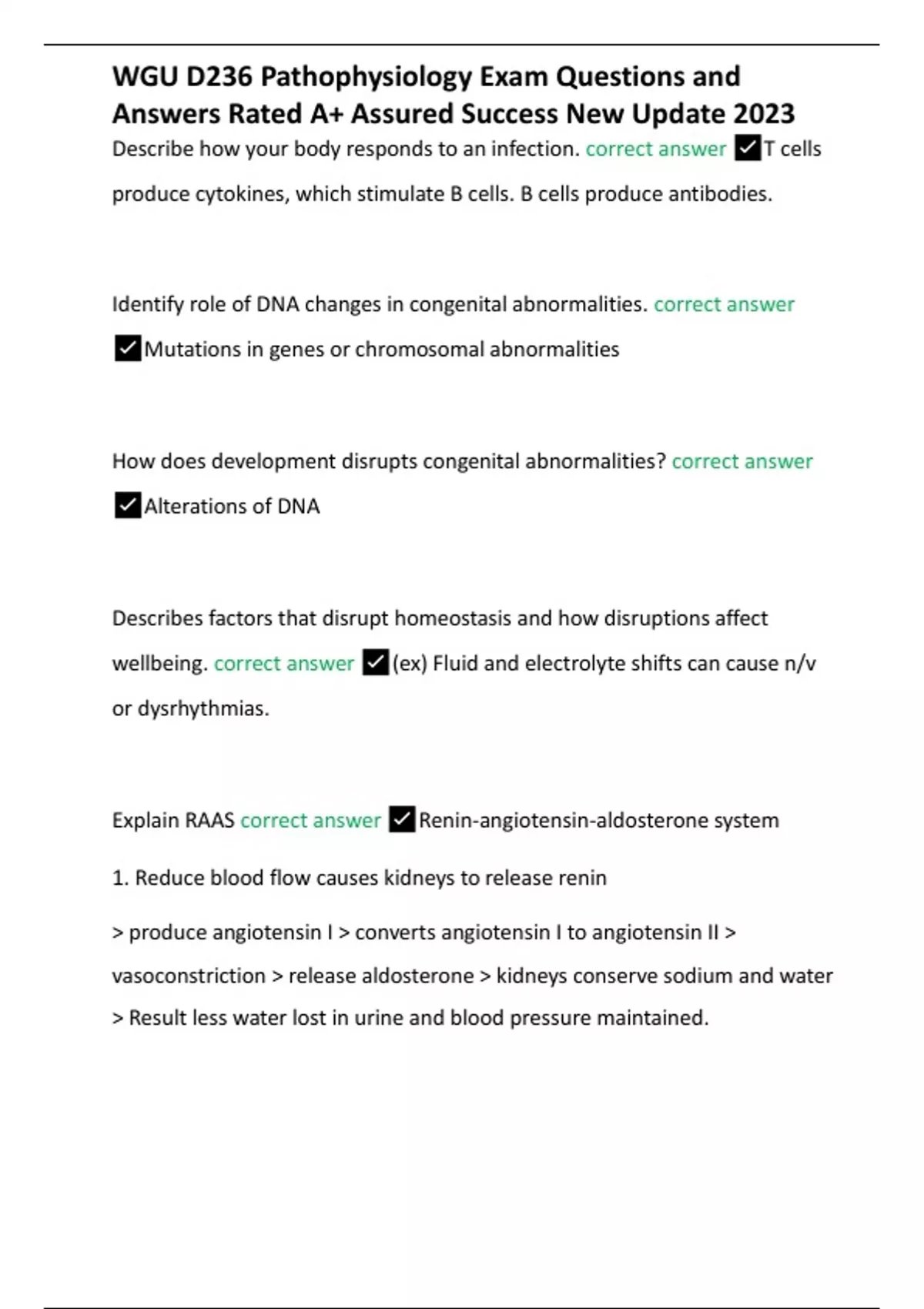 Describe how your body responds to an infection. correct answer T cells produce cytokines, which stimulate B cells. B cells produce antibodies. Identify role of DNA changes in congenital abnormalities. correct answer Mutations in genes or chromosomal abnormalities How does development disrupts congenital abnormalities? correct answer Alterations of DNA Describes factors that disrupt homeostasis and how disruptions affect wellbeing. correct answer (ex) Fluid and electrolyte shifts can cause n/v or dysrhythmias. Explain RAAS correct answer Renin-angiotensin-aldosterone system 1. Reduce blood flow causes kidneys to release renin > produce angiotensin I > converts angiotensin I to angiotensin II > vasoconstriction > release aldosterone > kidneys conserve sodium and water > Result less water lost in urine and blood pressure maintained. WGU D236 Pathophysiology Exam Questions and Answers Rated A+ Assured Success New Update 2023 DKA correct answer increased anion gap, decreased HCO3 How do kidneys compensate for alkalosis correct answer retain H and excrete HCO3 Untreated acidosis leads to an increase in which electrolyte? correct answer Potassium West Nile Virus correct answer Transmitted through the bite of an infected mosquito. Severe signs and symptoms; high fever, headache and stiff neck Lyme disease correct answer Tick-borne disease caused by the spirochete Borrelia burgdorferi. Erythema infectiosum correct answer a febrile upper respiratory illness in a child followed by the sudden appearance of red, flushed cheeks, "fifth disease" WGU D236 Pathophysiology Exam Questions and Answers Rated A+ Assured Success New Update 2023 Obesity ad diabetes are risk factors for having a child with _____. correct answer Spina bifida Trousseau's sign correct answer arm/carpal spasm associated with hypocalcemia Cause and sign of spina bifida correct answer results from failure of neural tube to close. sign - fluid filled sac on lower back. hemophilia is more common in correct answer males Prenatal exposure to alcohol includes correct answer ND-PAE, decreased brain function, FAS Connective vs muscle tissue disorders correct answer Connective- RA, Scleroderma, Lupus Muscle - MS, Muscular dystrophy, Myasthenia Gravia WGU D236 Pathophysiology Exam Questions and Answers Rated A+ Assured Success New Update 2023 Describe Lupus correct answer Inflammatory disorder characterized by joint pain and butterfly rash Describe Myasthenia Gravis correct answer It is an autoimmune disorder where antibodies attack own Ach receptors. This causes weakness of skeletal muscles over the course of the day, along with ptosis, double vision, and difficulty swallowing. dermatitis correct answer inflammation of the skin eczema correct answer noninfectious, inflammatory skin disease characterized by redness, blisters, scabs, and itching decubitus ulcer correct answer sore caused by lying down for long periods of time Fungal infections correct answer superficial, localized skin conditions or deep tissue infections caused by exposure to spores WGU D236 Pathophysiology Exam Questions and Answers Rated A+ Assured Success New Update 2023 may or may not be transmitted benign neoplasm correct answer noncancerous growths, stationary, distinct borders malignant neoplasm correct answer uncontrolled new tissue growth, irregular borders, spreads Osteoporosis correct answer The loss of bone mass often due to age, causing the bones to become porous, brittle, and easily fractured. osteomalacia correct answer disease marked by softening of the bone caused by calcium and vitamin D deficiency myoglobin correct answer red pigment that stores oxygen in muscle cells Bursa correct answer fluid-filled sac that allows for easy movement of one part of a joint over another WGU D236 Pathophysiology Exam Questions and Answers Rated A+ Assured Success New Update 2023 Rickets correct answer a vitamin D deficiency in children, resulting in soft bones Degenerative disk disease correct answer A condition in which an intervertebral disk loses its normal structural integrity as a result of wear and tear, acute or repeated injuries or agin