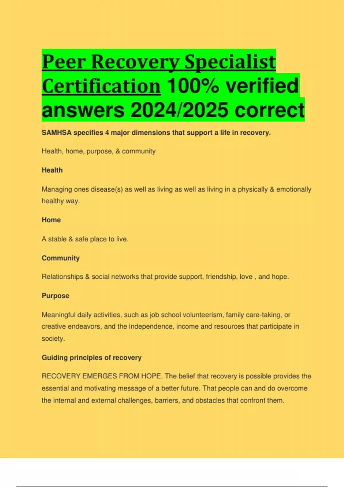 Peer Recovery Specialist Certification 100% verified answers 2024/2025 correct