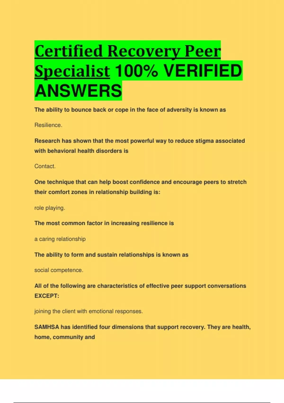 Certified Recovery Peer Specialist 100% VERIFIED ANSWERS