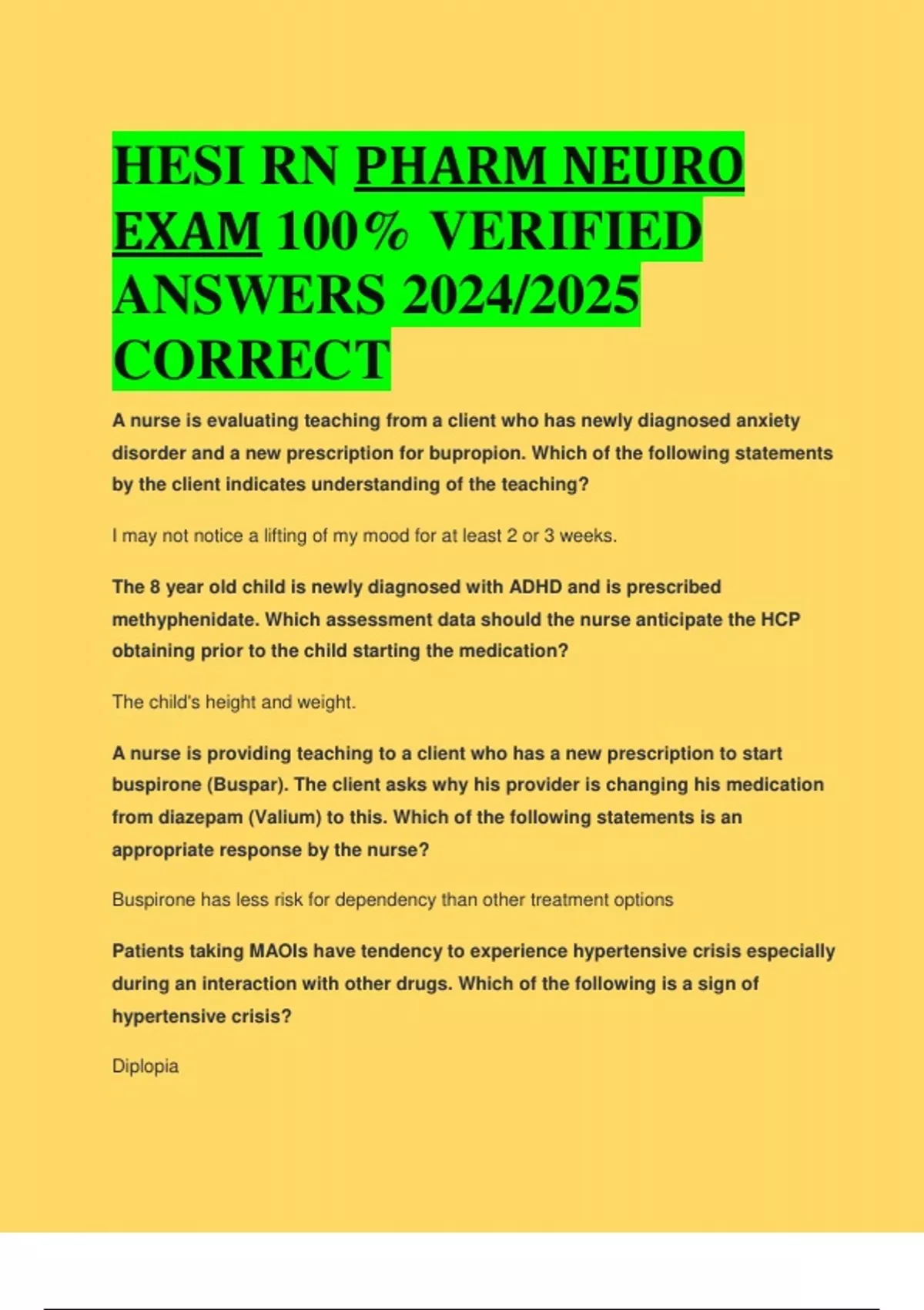 BEST ANSWERS HESI RN PHARM NEURO EXAM 100% VERIFIED ANSWERS 2024/2025 CORRECT