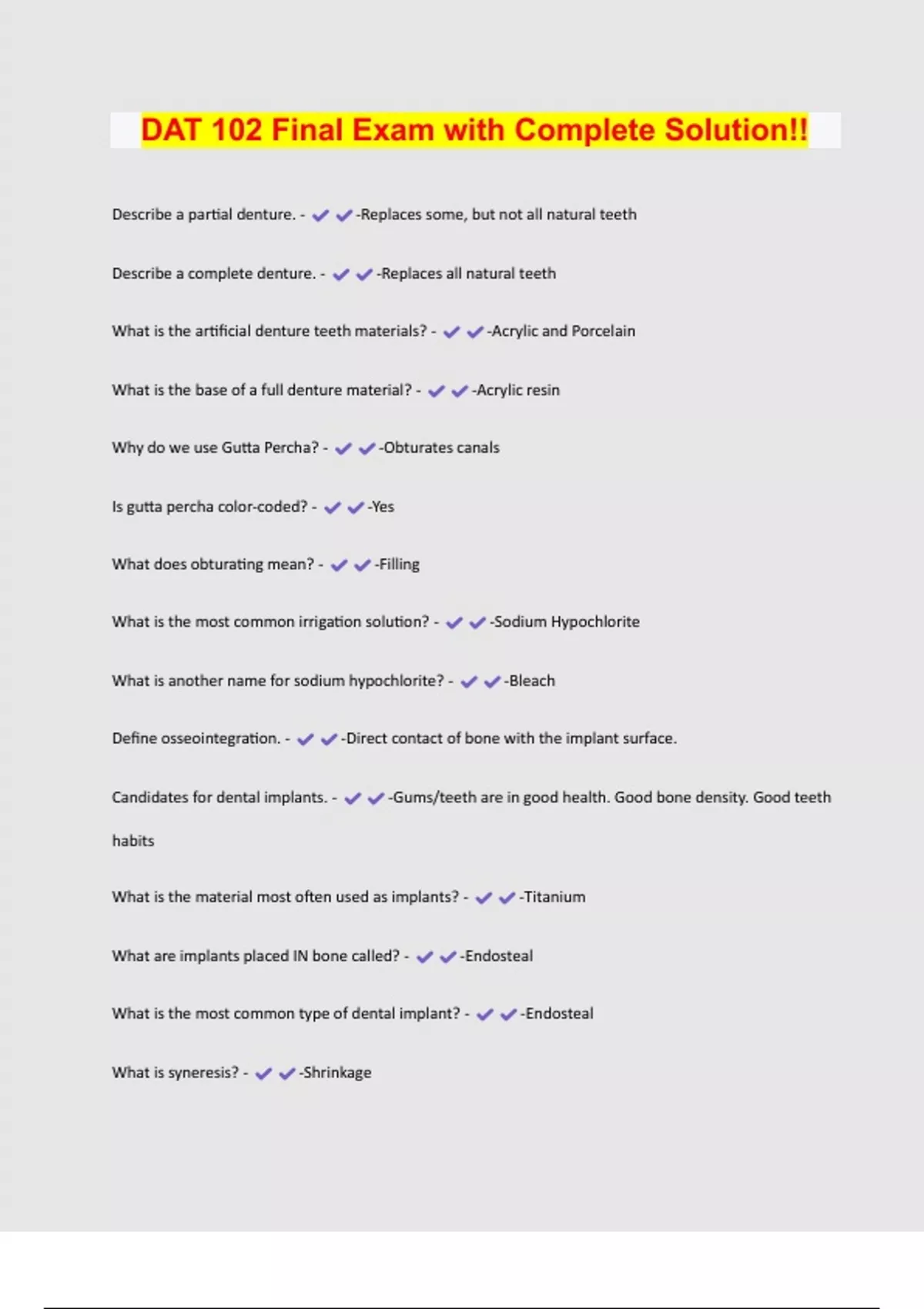 DAT 102 Final Exam with Complete Solution!! Describe a partial denture. - -Replaces some, but not all natural teeth Describe a complete denture. - -Replaces all natural teeth What is the artificial denture teeth materials? - -Acrylic and Porcelain What is the base of a full denture material? - -Acrylic resin Why do we use Gutta Percha? - -Obturates canals Is gutta percha color-coded? - -Yes What does obturating mean? - -Filling What is the most common irrigation solution? - -Sodium Hypochlorite What is another name for sodium hypochlorite? - -Bleach Define osseointegration. - -Direct contact of bone with the implant surface. Candidates for dental implants. - -Gums/teeth are in good health. Good bone density. Good teeth habits What is the material most often used as implants? - -Titanium What are implants placed IN bone called? - -Endosteal What is the most common type of den