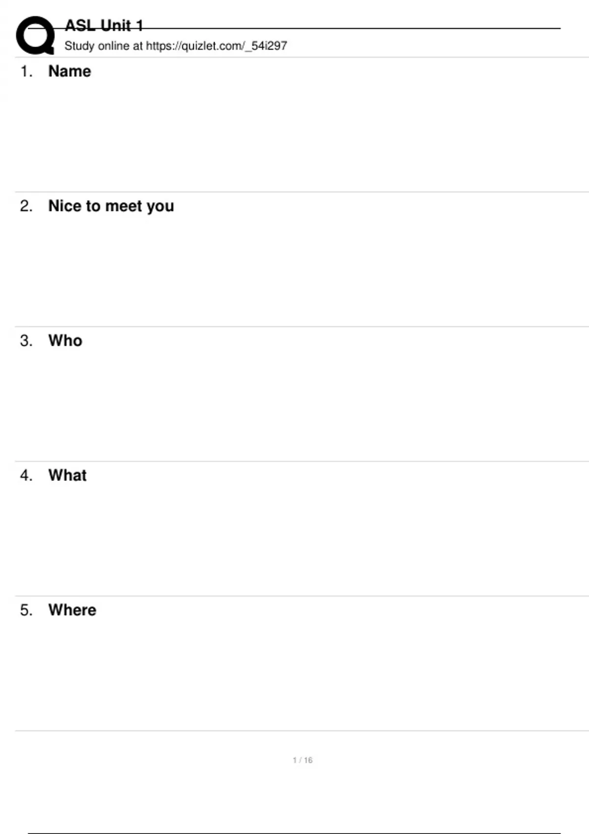 ASL Unit 1 Study online at 1. Name 2. Nice to meet you 3. Who 4. What 5. Where 1 / 16 ASL Unit 1 Study online at 6. There 7. You 8. Me 9. Deaf 10. Hearing 11. Hard-of-hearing 2 / 16 ASL Unit 1 Study online at 12. Copy me 13. Again 14. Remember 15. Forget 16. Number