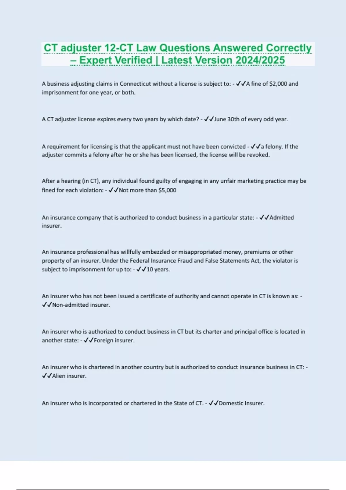 CT adjuster 12-CT Law Questions Answered Correctly – Expert Verified | Latest Version 2024/2025