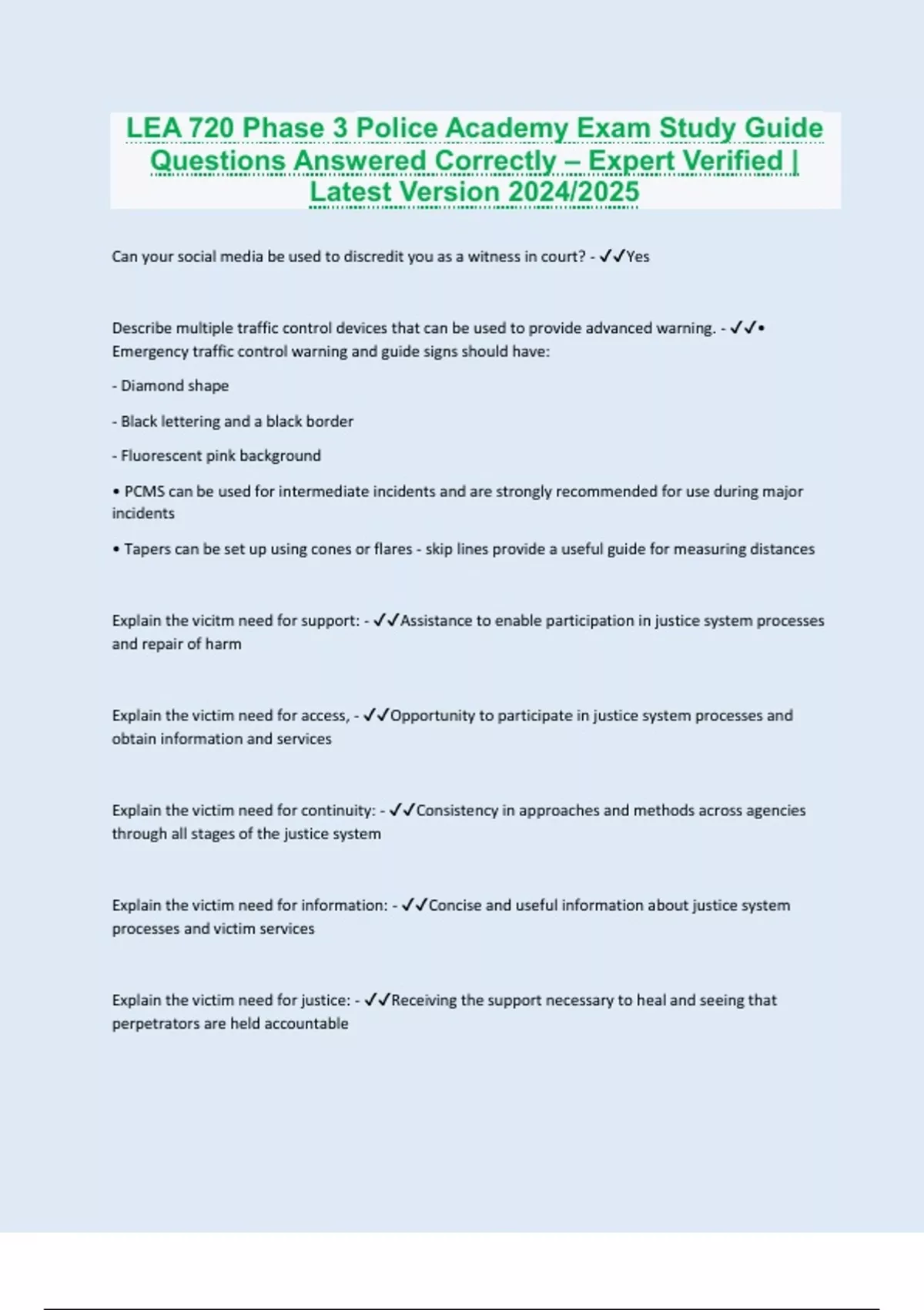 Can your social media be used to discredit you as a witness in court? - Yes Describe multiple traffic control devices that can be used to provide advanced warning. - • Emergency traffic control warning and guide signs should have: - Diamond shape - Black lettering and a black border - Fluorescent pink background • PCMS can be used for intermediate incidents and are strongly recommended for use during major incidents • Tapers can be set up using cones or flares - skip lines provide a useful guide for measuring distances Explain the vicitm need for support: - Assistance to enable participation in justice system processes and repair of harm Explain the victim need for access, - Opportunity to participate in justice system processes and obtain information and services Explain the victim need for continuity: - Consistency in approaches and methods across agencies through all stages of the justice system