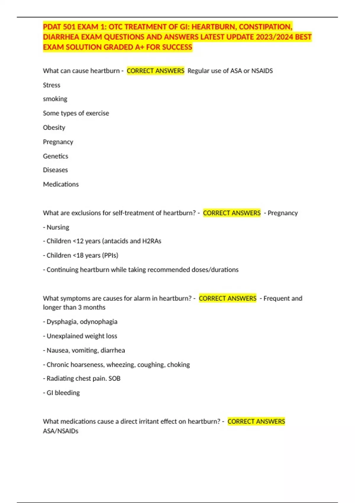 PDAT 501 EXAM 1: OTC TREATMENT OF GI: HEARTBURN, CONSTIPATION, DIARRHEA EXAM QUESTIONS AND ANSWERS LATEST UPDATE 2023/2024 BEST EXAM SOLUTION GRADED A+ FOR SUCCESS