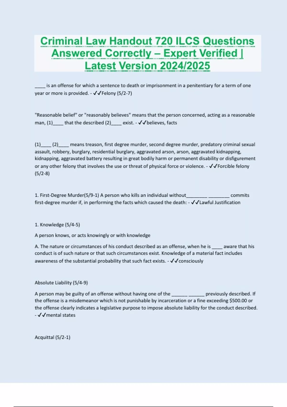 Criminal Law Handout 720 ILCS Questions Answered Correctly – Expert Verified | Latest Version 2024/2025