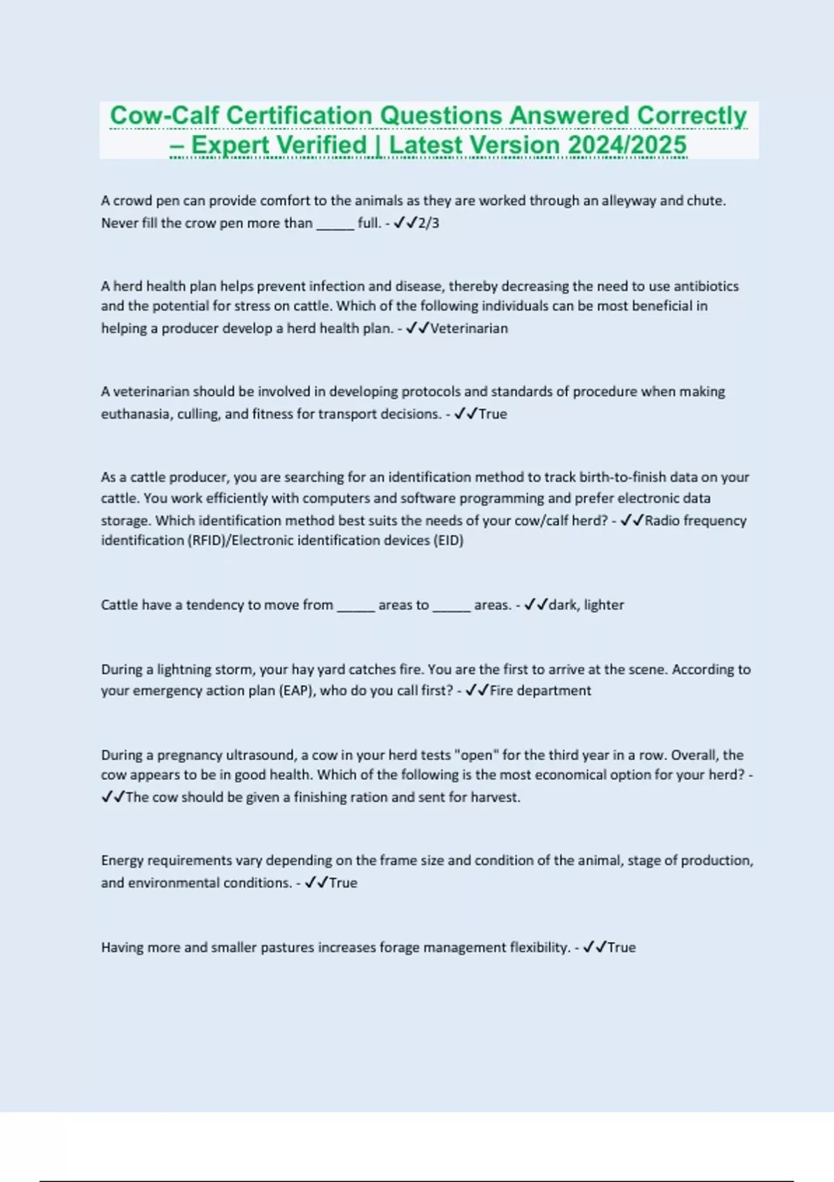 Cow-Calf Certification Questions Answered Correctly – Expert Verified | Latest Version 2024/2025