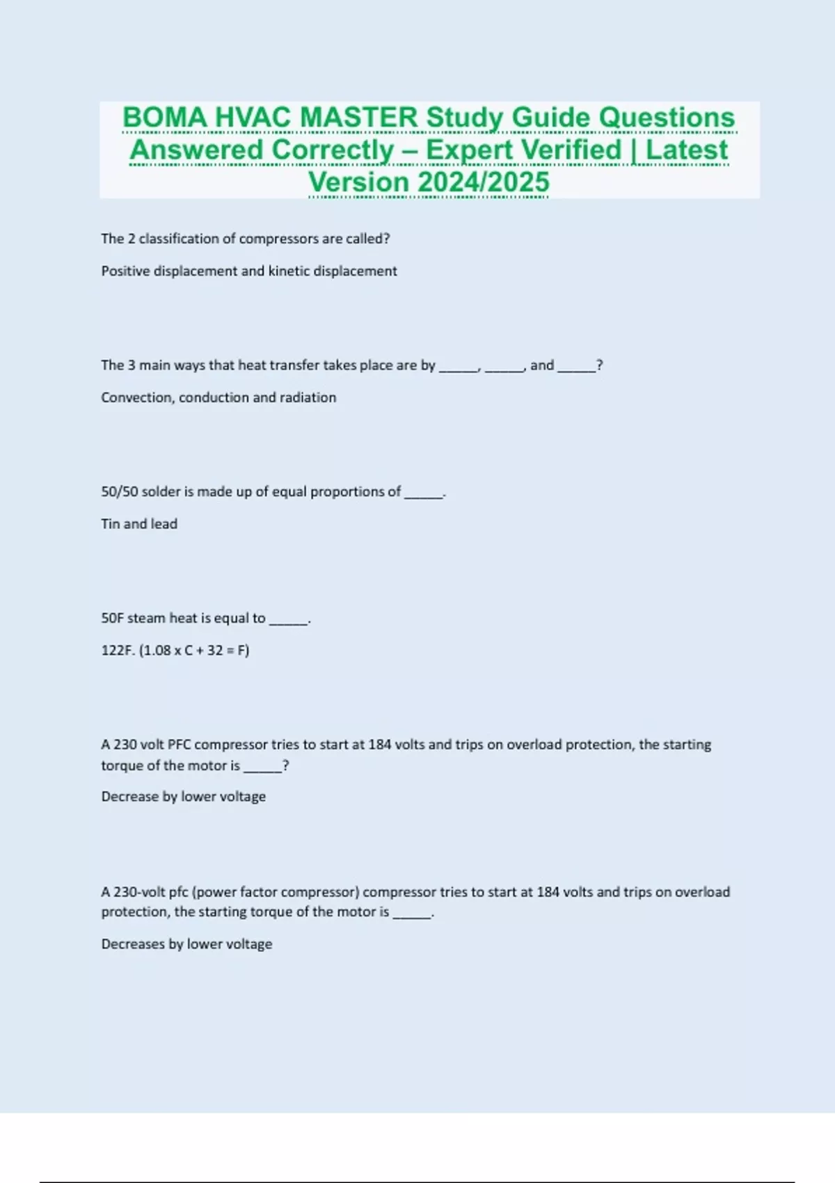 The 2 classification of compressors are called? Positive displacement and kinetic displacement The 3 main ways that heat transfer takes place are by _____, _____, and _____? Convection, conduction and radiation 50/50 solder is made up of equal proportions of _____. Tin and lead 50F steam heat is equal to _____. 122F. (1.08 x C + 32 = F) A 230 volt PFC compressor tries to start at 184 volts and trips on overload protection, the starting torque of the motor is _____? Decrease by lower voltage A 230-volt pfc (power factor compressor) compressor tries to start at 184 volts and trips on overload protection, the starting torque of the motor is _____. Decreases by lower voltage