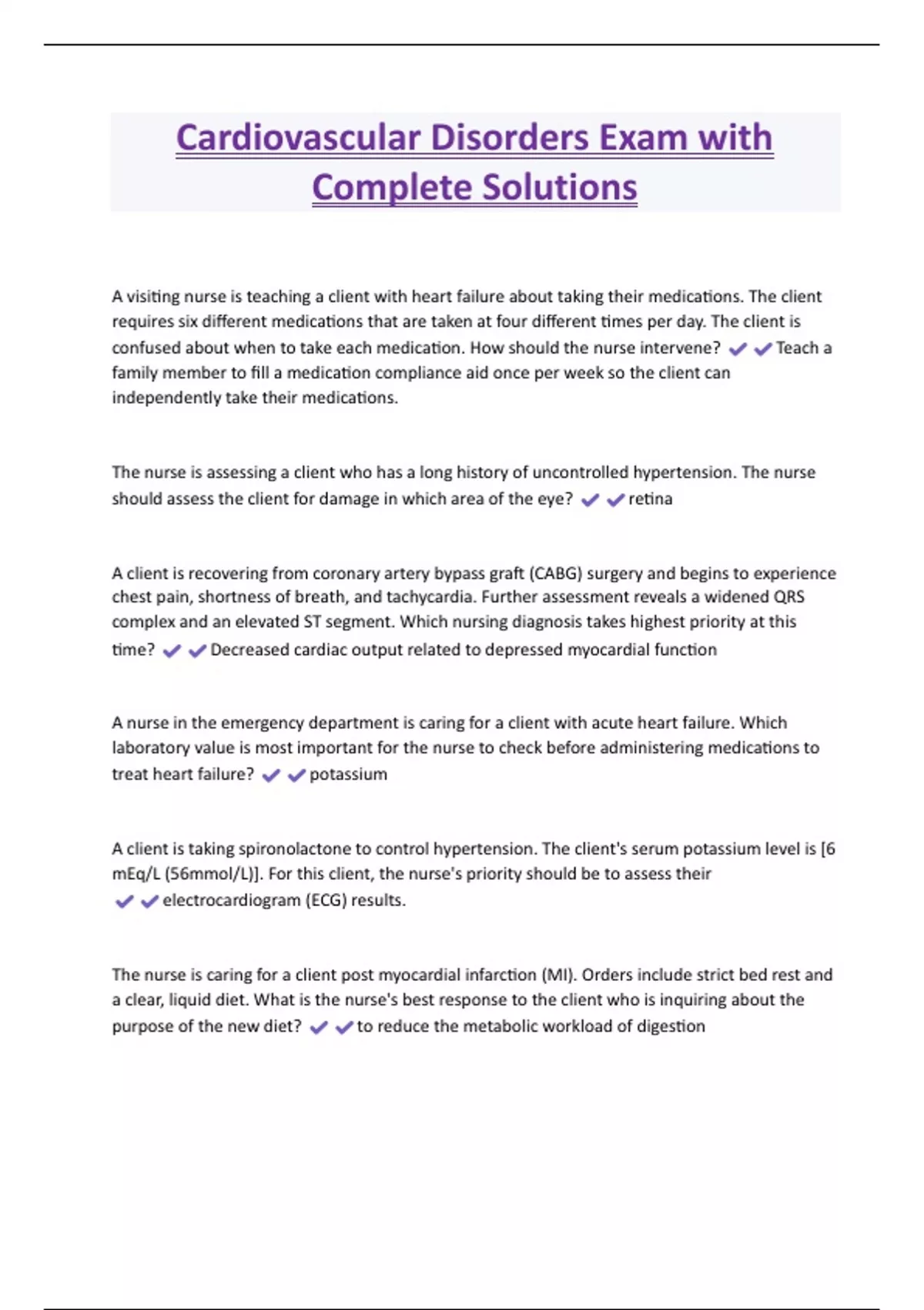 Cardiovascular Disorders Exam with Complete Solutions A visiting nurse is teaching a client with heart failure about taking their medications. The client requires six different medications that are taken at four different times per day. The client is confused about when to take each medication. How should the nurse intervene? Teach a family member to fill a medication compliance aid once per week so the client can independently take their medications. The nurse is assessing a client who has a long history of uncontrolled hypertension. The nurse should assess the client for damage in which area of the eye? retina A client is recovering from coronary artery bypass graft (CABG) surgery and begins to experience chest pain, shortness of breath, and tachycardia. Further assessment reveals a widened QRS complex and an elevated ST segment. Which nursing diagnosis takes highest priority at this time? Decreased cardiac output related to depressed myocardial function