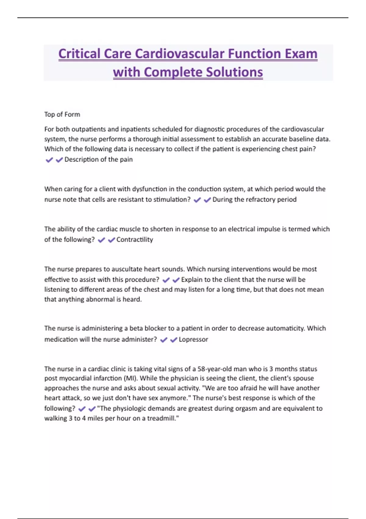 Critical Care Cardiovascular Function Exam with Complete Solutions Top of Form For both outpatients and inpatients scheduled for diagnostic procedures of the cardiovascular system, the nurse performs a thorough initial assessment to establish an accurate baseline data. Which of the following data is necessary to collect if the patient is experiencing chest pain? Description of the pain When caring for a client with dysfunction in the conduction system, at which period would the nurse note that cells are resistant to stimulation? During the refractory period The ability of the cardiac muscle to shorten in response to an electrical impulse is termed which of the following? Contractility