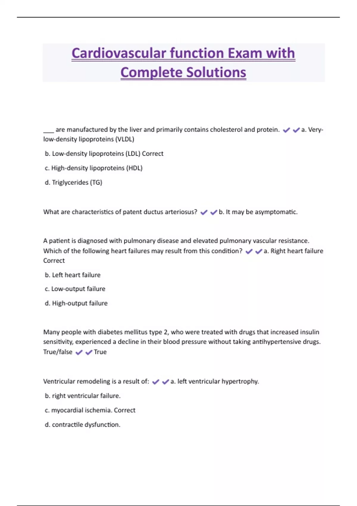Cardiovascular function Exam with Complete Solutions ___ are manufactured by the liver and primarily contains cholesterol and protein. a. Verylow-density lipoproteins (VLDL) b. Low-density lipoproteins (LDL) Correct c. High-density lipoproteins (HDL) d. Triglycerides (TG) What are characteristics of patent ductus arteriosus? b. It may be asymptomatic. A patient is diagnosed with pulmonary disease and elevated pulmonary vascular resistance. Which of the following heart failures may result from this condition? a. Right heart failure Correct b. Left heart failure c. Low-output failure d. High-output failure