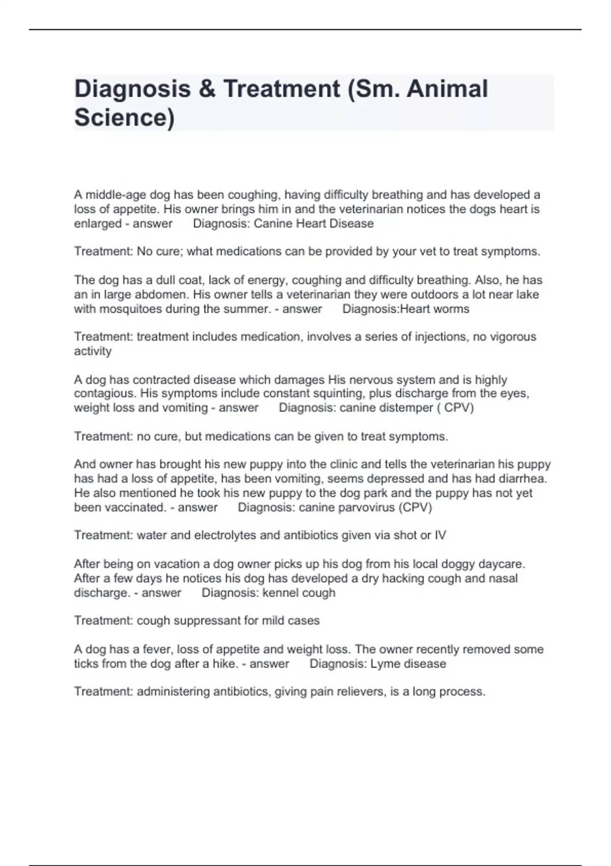 Diagnosis & Treatment (Sm. Animal Science) Questions and Answers Graded A