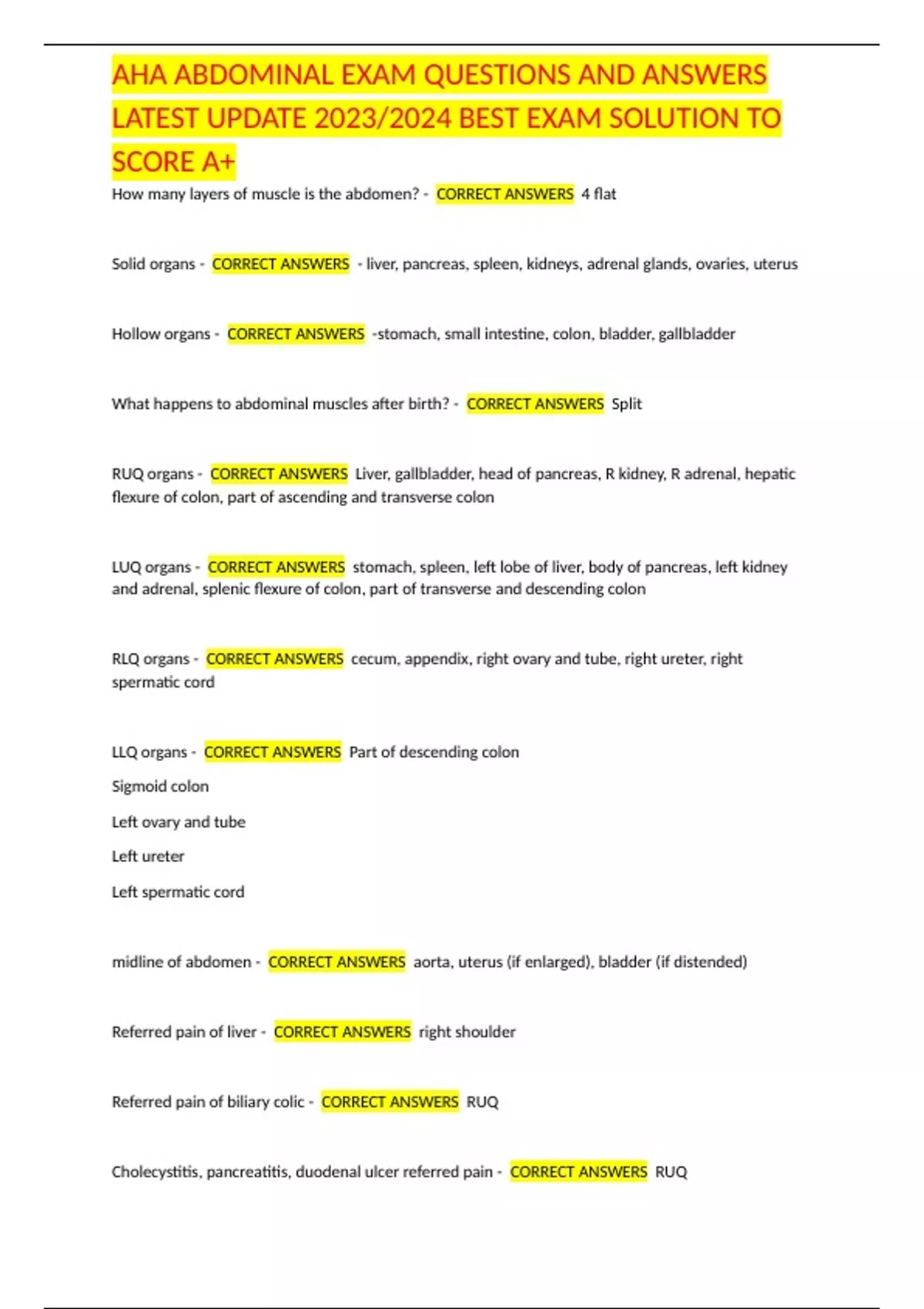 AHA ABDOMINAL EXAM QUESTIONS AND ANSWERS LATEST UPDATE 2023/2024 BEST EXAM SOLUTION TO SCORE A+