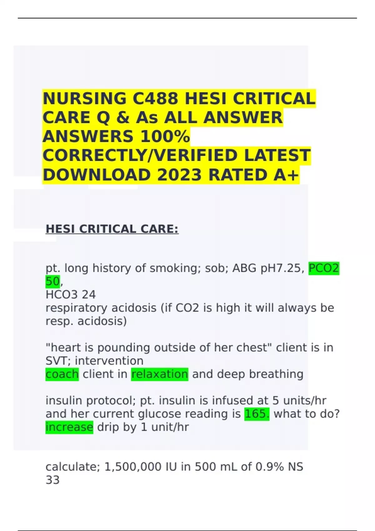 NURSING C488 HESI CRITICAL CARE Q & As ALL ANSWER ANSWERS 100% CORRECTLY/VERIFIED LATEST DOWNLOAD 2023 RATED A+