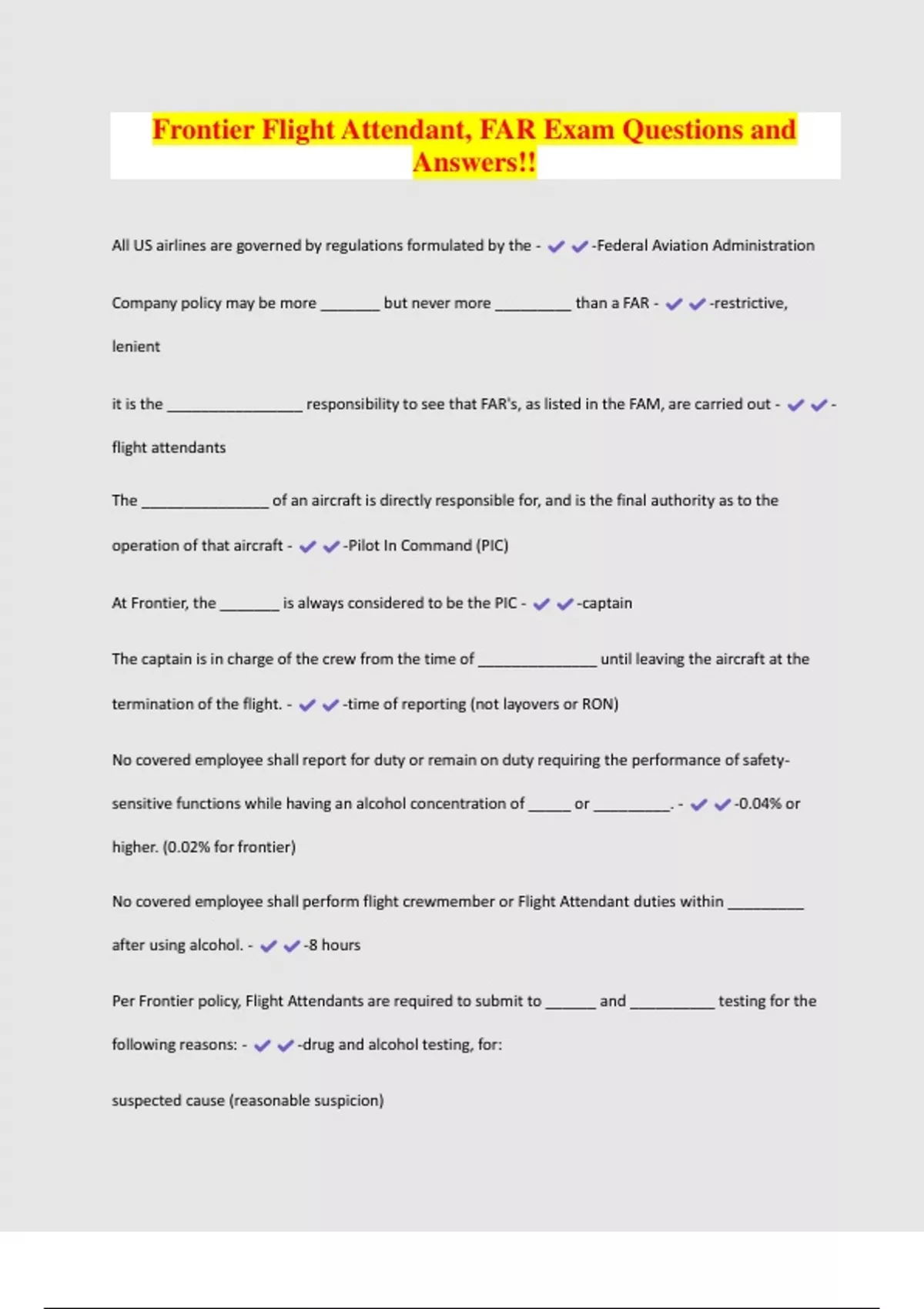 Frontier Flight Attendant, FAR Exam Questions and Answers!!