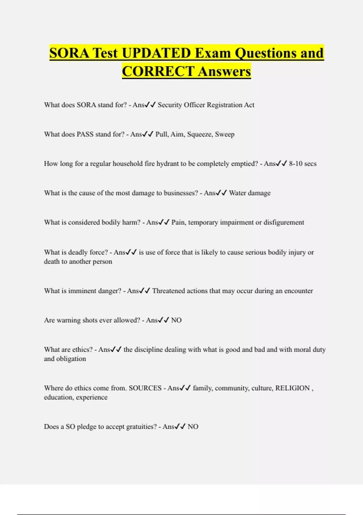 SORA Test UPDATED Exam Questions and CORRECT Answers What does SORA stand for? - Ans Security Officer Registration Act What does PASS stand for? - Ans Pull, Aim, Squeeze, Sweep How long for a regular household fire hydrant to be completely emptied? - Ans 8-10 secs What is the cause of the most damage to businesses? - Ans Water damage
