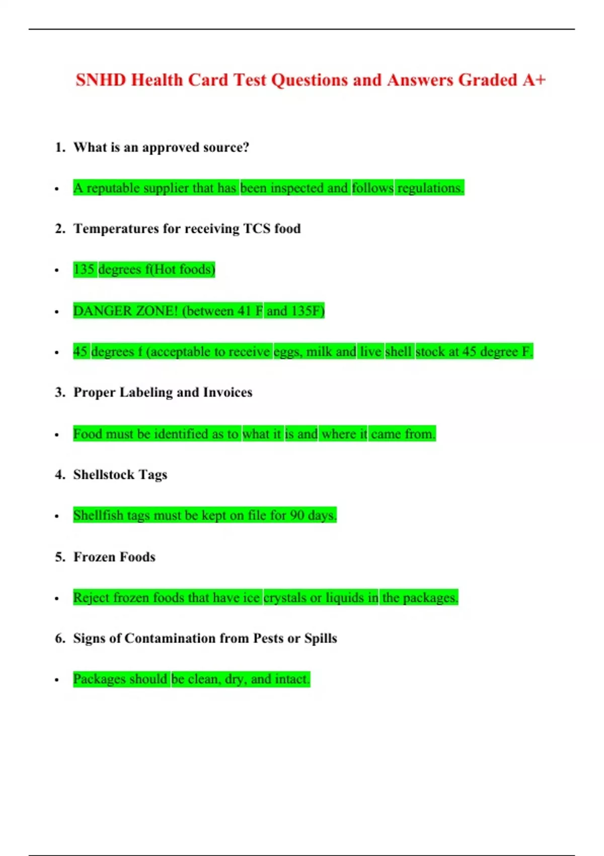 SNHD Health Card Test Questions and Answers Graded A+ 1. What is an approved source? • A reputable supplier that has been inspected and follows regulations.