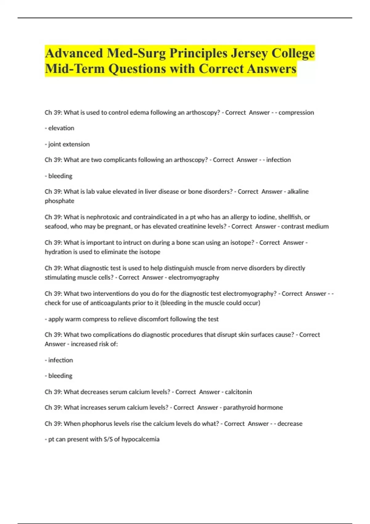 Advanced Med-Surg Principles Jersey College Mid-Term Questions with Correct Answers.