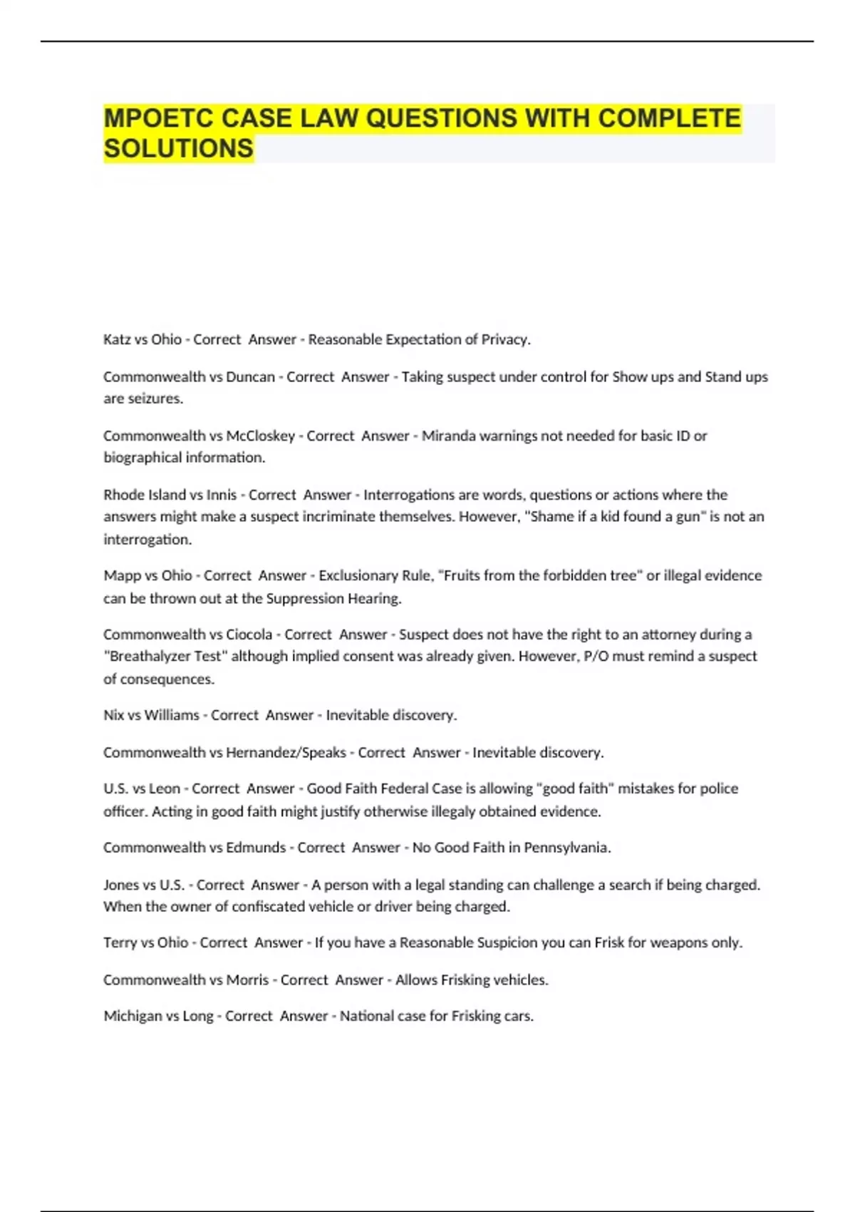 MPOETC CASE LAW QUESTIONS WITH COMPLETE SOLUTIONS.