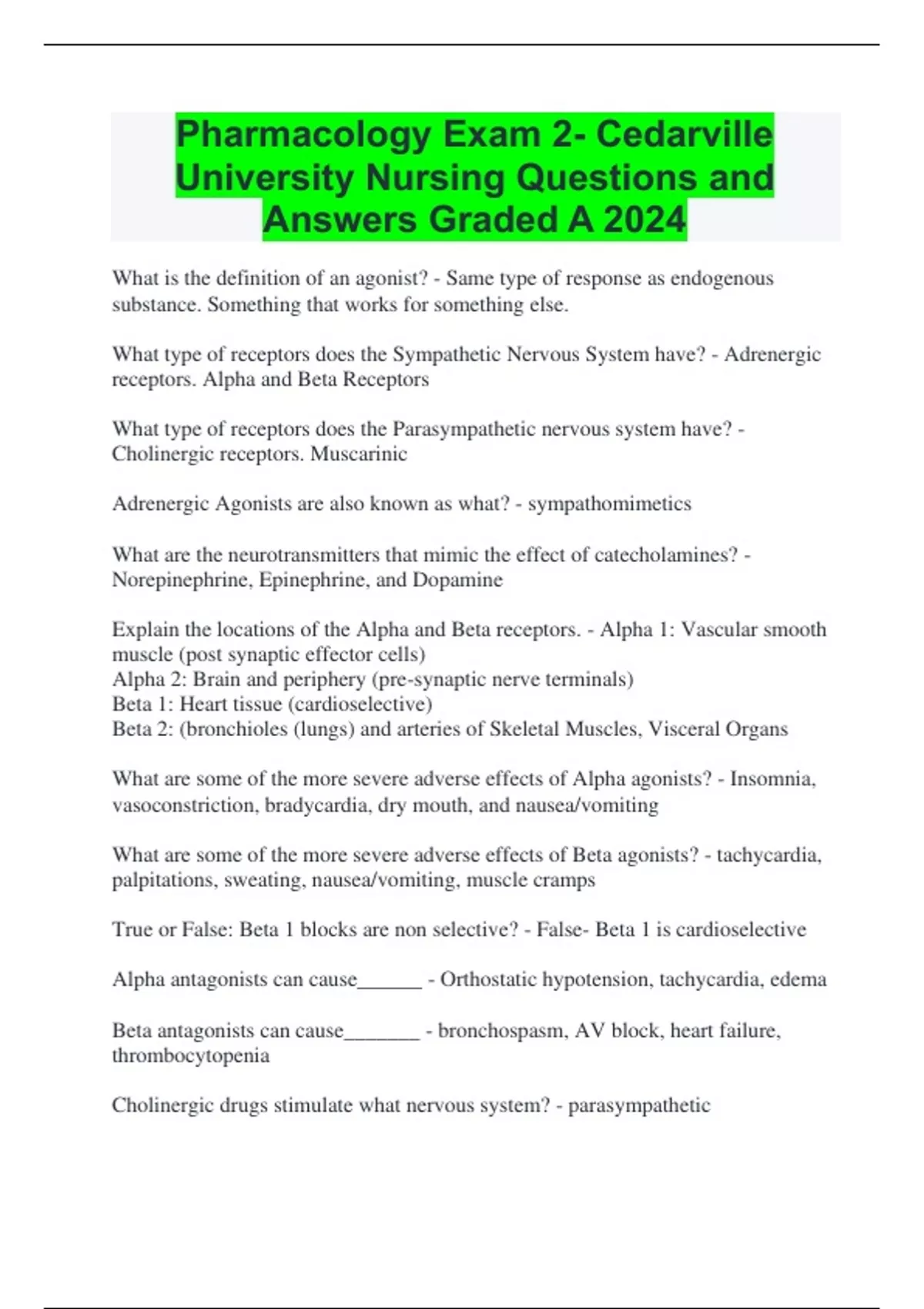 Pharmacology Exam 2- Cedarville University Nursing Questions and Answers Graded A 2024