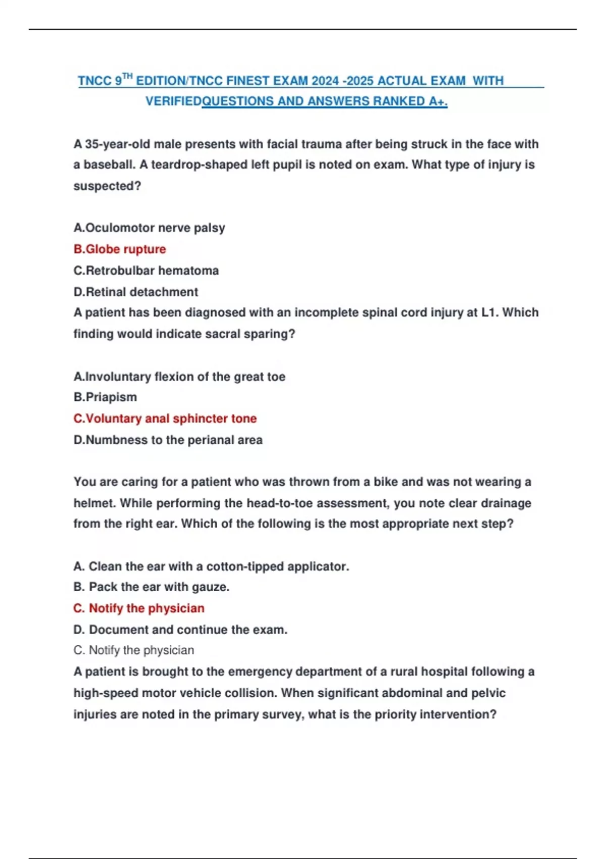 TNCC 9TH EDITION/TNCC FINEST EXAM ACTUAL EXAM WITH VERIFIEDQUESTIONS AND ANSWERS RANKED A+. A 35-year-old male presents with facial trauma after being struck in the face with a baseball. A teardrop-shaped left pupil is noted on exam. What type of injury is suspected? A.Oculomotor nerve palsy B.Globe rupture C.Retrobulbar hematoma D.Retinal detachment A patient has been diagnosed with an incomplete spinal cord injury at L1. Which finding would indicate sacral sparing? A.Involuntary flexion of the great toe B.Priapism C.Voluntary anal sphincter tone D.Numbness to the perianal area You are caring for a patient who was thrown from a bike and was not wearing a helmet. While performing the head-to-toe assessment, you note clear drainage from the right ear. Which of the following is the most appropriate next step? A. Clean the ear with a cotton-tipped applicator. B. Pack the ear with gauze. C. Notify the physician D. Document and continue the exam. C. Notify the physician