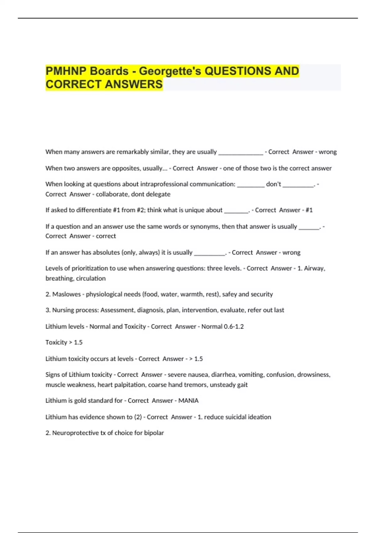 PMHNP Boards - Georgette's QUESTIONS AND CORRECT ANSWERS.