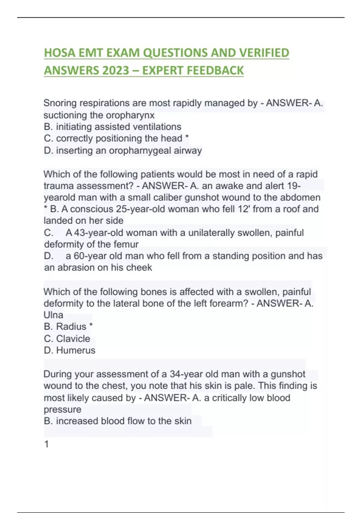 HOSA EMT EXAM QUESTIONS AND VERIFIED ANSWERS 2023 – EXPERT FEEDBACK