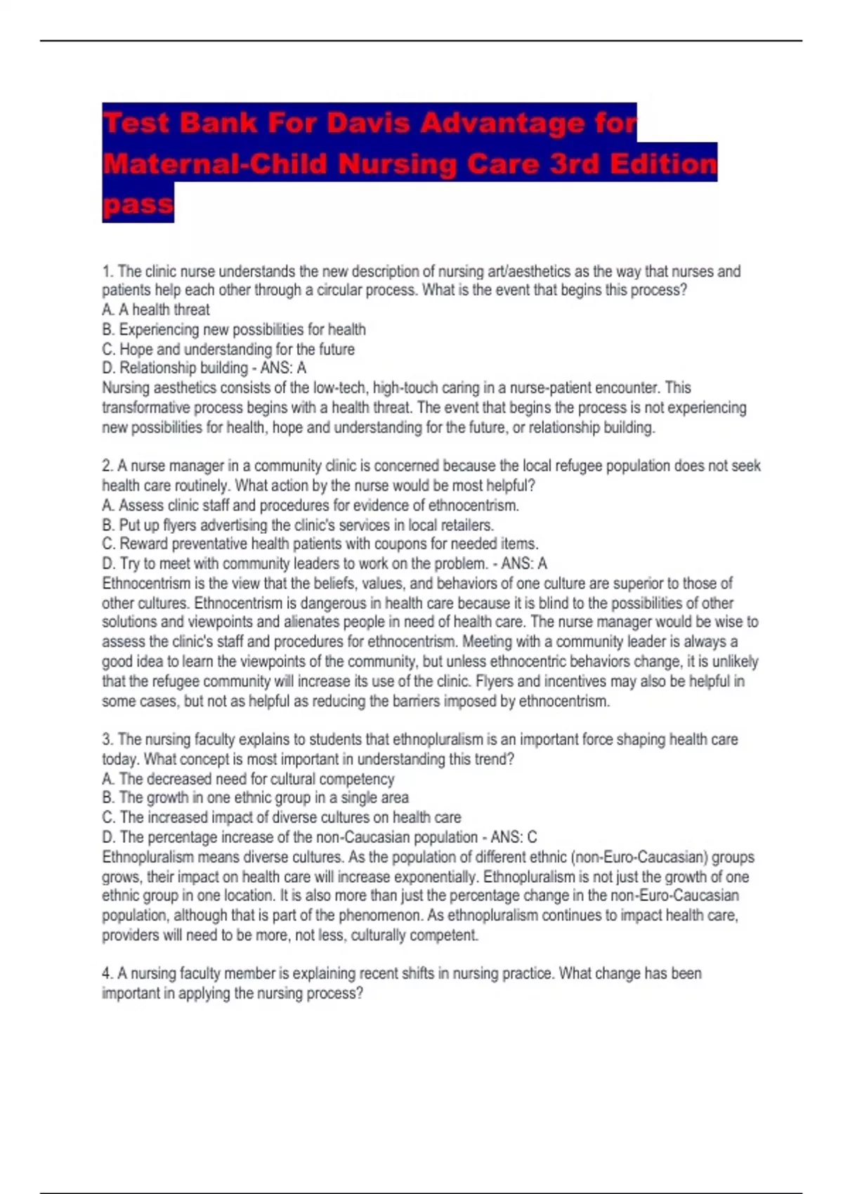 Test Bank For Davis Advantage for Maternal-Child Nursing Care 3rd Edition pass 1. The clinic nurse understands the new description of nursing art/aesthetics as the way that nurses and patients help each other through a circular process. What is the event that begins this process? A. A health threat B. Experiencing new possibilities for health C. Hope and understanding for the future D. Relationship building - ANS: A Nursing aesthetics consists of the low-tech, high-touch caring in a nurse-patient encounter. This transformative process begins with a health threat. The event that begins the process is not experiencing new possibilities for health, hope and understanding for the future, or relationship building. 2. A nurse manager in a community clinic is concerned because the local refugee population does not seek health care routinely. What action by the nurse would be most helpful? A. Assess clinic staff and procedures for evidence of ethnocentrism. B. Put up flyers advertising the clinic's services in local retailers. C. Reward preventative health patients with coupons for needed items. D. Try to meet with community leaders to work on the problem. - ANS: A Ethnocentrism is the view that the beliefs, values, and behaviors of one culture are superior to those of other cultures. Ethnocentrism is dangerous in health care because it is blind to the possibilities of other solutions and viewpoints and alienates people in need of health care. The nurse manager would be wise to assess the clinic's staff and procedures for ethnocentrism. Meeting with a community leader is always a good idea to learn the viewpoints of the community, but unless ethnocentric behaviors change, it is unlikely that the refugee community will increase its use of the clinic. Flyers and incentives may also be helpful in some cases, but not as helpful as reducing the barriers imposed by ethnocentrism. 3. The nursing faculty explains to students that ethnopluralism is an important force shaping health care today. What concept is most important in understanding this trend? A. The decreased need for cultural competency B. The growth in one ethnic group in a single area C. The increased impact of diverse cultures on health care D. The percentage increase of the non-Caucasian population - ANS: C Ethnopluralism means diverse cultures. As the population of different ethnic (non-Euro-Caucasian) groups grows, their impact on health care will increase exponentially. Ethnopluralism is not just the growth of one ethnic group in one location. It is also more than just the percentage change in the non-Euro-Caucasian population, although that is part of the phenomenon. As ethnopluralism continues to impact health care, providers will need to be more, not less, culturally competent. 4. A nursing faculty member is explaining recent shifts in nursing practice. What change has been important in applying the nursing process? A. A change to a spiral or circular process B. A focus on more independent nursing actions C. A return to the nurse-as-expert model of care D. An emphasis on attaining a disease-free state - ANS: A The nursing process has recently changed from a linear one to a spiral or circular process in which the patient/family is motivated toward promotion, maintenance, and restoration of health. The focus has not changed to include more independent actions, a return to the nurse-as-expert model, or an emphasis on attaining a disease-free state of being. 5. A nurse is working in an urban clinic with a diverse population. What action by the nurse is most important? A. Determine patients' definitions of health and desired outcomes of health care. B. Explain policies such as appointment cancellations to ensure compliance. C. Learn to speak one or two common languages of the patients in the clinic. D. Read about different folk remedies common among the populations seen. - ANS: A Divergent populations enter the health-care system with differing beliefs about health care and wellness and differing expectations for the outcomes of such experiences. Understanding these expectations will help the nurse plan care that has a better chance of meeting these expectations. Learning languages and becoming familiar with folk remedies is helpful as well, but these two solutions are very limited in scope and a nurse cannot hope to become proficient in all the languages/behaviors of every population seen, leaving some patients with a lessened experience. Explaining policies is important too, but simply telling someone the rules does not take his or her cultural norms into account and may not be successful. 6. A nurse is working with a minority group that has a high incidence of cardiovascular disease, including hypertension and stroke. When participating in a community health fair with this group, what action by the nurse will be most effective? A. Educate the participants about weight loss and a low-sodium, low-fat diet. B. Explain the genetic basis for the high incidence of cardiovascular disease in the group. C. Help participants make lifestyle changes that are culturally congruent. D. Present statistics on the mortality and morbidity of cardiovascular disease. - ANS: C The ever-increasing culturally diverse population interacting with the health-care system brings its own beliefs, values, and health-related practices that impact health and well-being. In order to help people make healthy lifestyle changes, the changes must be culturally cong
