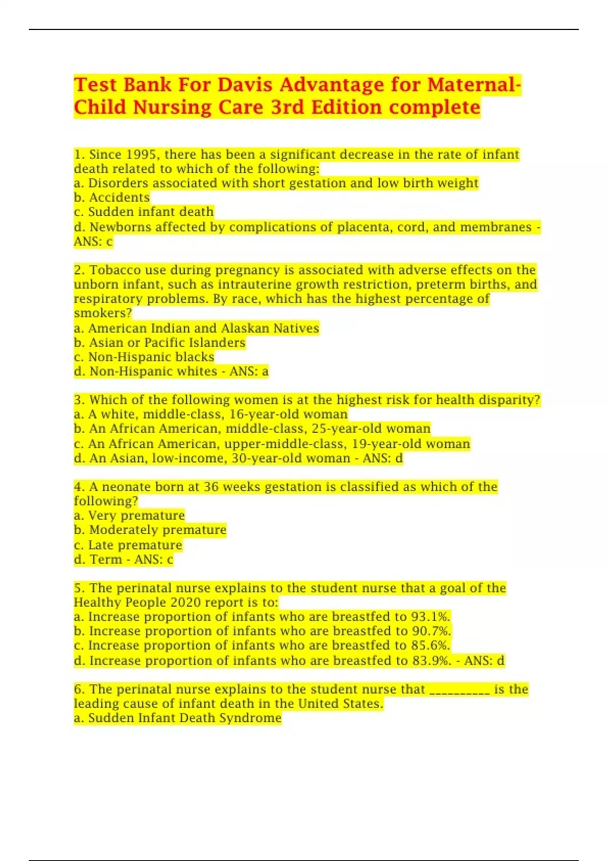 Test Bank For Davis Advantage for Maternal- Child Nursing Care 3rd Edition complete 1. Since 1995, there has been a significant decrease in the rate of infant death related to which of the following: a. Disorders associated with short gestation and low birth weight b. Accidents c. Sudden infant death d. Newborns affected by complications of placenta, cord, and membranes - ANS: c 2. Tobacco use during pregnancy is associated with adverse effects on the unborn infant, such as intrauterine growth restriction, preterm births, and respiratory problems. By race, which has the highest percentage of smokers? a. American Indian and Alaskan Natives b. Asian or Pacific Islanders c. Non-Hispanic blacks d. Non-Hispanic whites - ANS: a 3. Which of the following women is at the highest risk for health disparity? a. A white, middle-class, 16-year-old woman b. An African American, middle-class, 25-year-old woman c. An African American, upper-middle-class, 19-year-old woman d. An Asian, low-income, 30-year-old woman - ANS: d 4. A neonate born at 36 weeks gestation is classified as which of the following? a. Very premature b. Moderately premature c. Late premature d. Term - ANS: c 5. The perinatal nurse explains to the student nurse that a goal of the Healthy People 2020 report is to: a. Increase proportion of infants who are breastfed to 93.1%. . b. Increase proportion of infants who are breastfed to 90.7% c. Increase proportion of infants who are breastfed to 85.6%. d. Increase proportion of infants who are breastfed to 83.9%. - ANS: d 6. The perinatal nurse explains to the student nurse that __________ is the leading cause of infant death in the United States. a. Sudden Infant Death Syndrome b. Respiratory distress of newborns c. Disorders related to short gestation and low birth weight d. Congenital malformations and chromosomal abnormalities - ANS: d 7. Which of the following statements are true related to teen pregnancies? (Select all that apply.) a. Teen mothers are at higher risk for HIV. b. Teen mothers are at higher risk for hypertensive problems. c. The birth rate for teenaged women has increased in the past 15 years. d. Infants born to teen mothers are at higher risk for health problems. - ANS: a, b, d An ethical dilemma unique to perinatal nursing is the: a. Innate conflict between maternal and fetal rights b. Intensive use of technology c. Shortage of health-care resources d. Risk of violation of the principle of veracity - ANS: a The American Nurses Association Code of Ethics for Nurses directs nurses to provide patient care that is: a. Curative b. Utilitarian c. Negotiable d. Respectful - ANS: d Evidence-based practice is the integration of the best: a. Randomized clinical trials, clinical expertise, and patients requests b. Research evidence, clinical expertise, and patients values c. Quantitative research, clinical expertise, and patients preferences d. Research findings, clinical experience, and patients preferences - ANS: b
