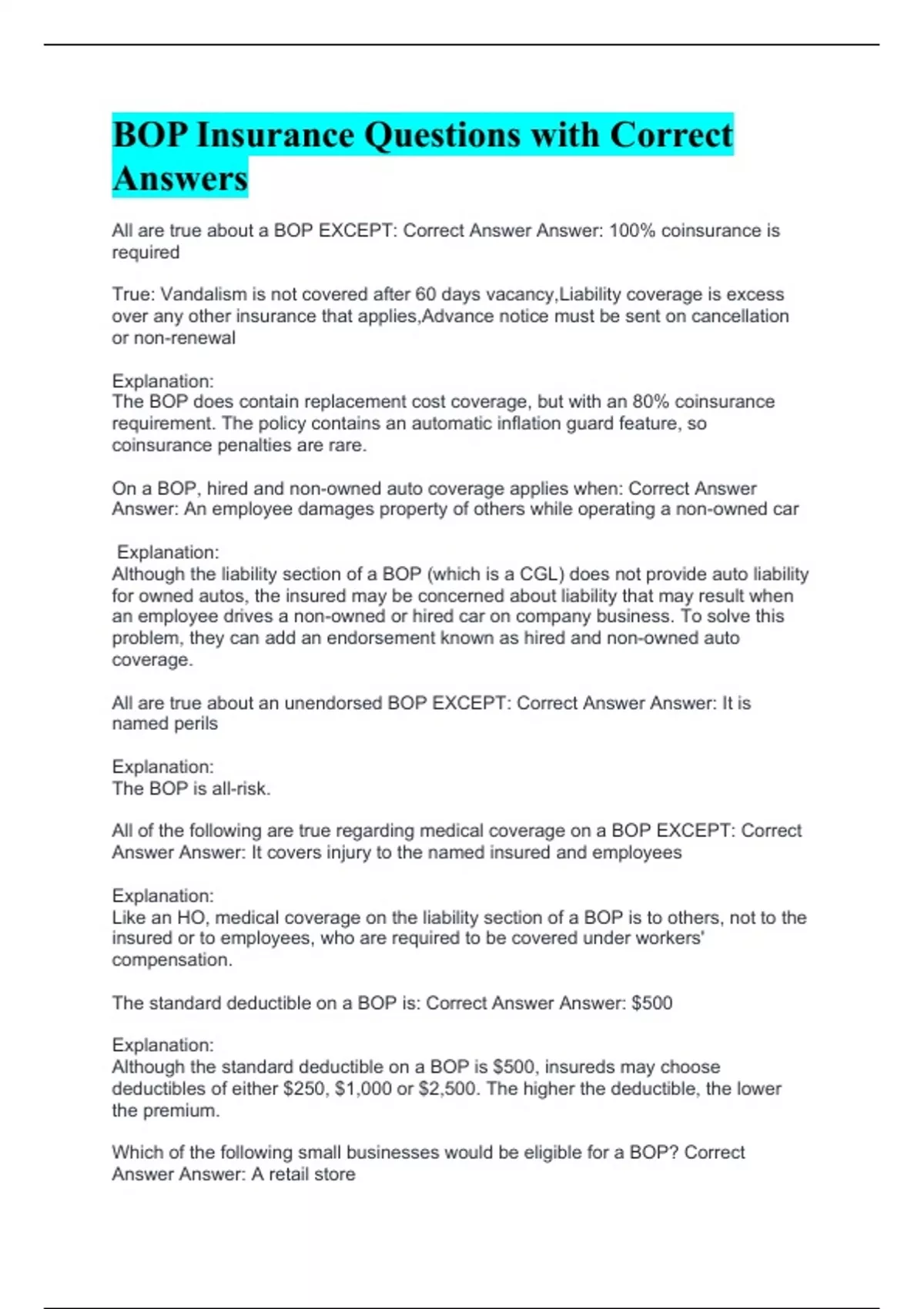 BOP Insurance Questions with Correct Answers