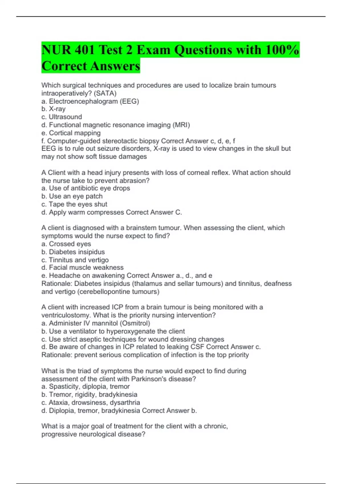 Which surgical techniques and procedures are used to localize brain tumours intraoperatively? (SATA) a. Electroencephalogram (EEG) b. X-ray c. Ultrasound d. Functional magnetic resonance imaging (MRI) e. Cortical mapping f. Computer-guided stereotactic biopsy Correct Answer c, d, e, f EEG is to rule out seizure disorders, X-ray is used to view changes in the skull but may not show soft tissue damages A Client with a head injury presents with loss of corneal reflex. What action should the nurse take to prevent abrasion? a. Use of antibiotic eye drops b. Use an eye patch c. Tape the eyes shut d. Apply warm compresses Correct Answer C. A client is diagnosed with a brainstem tumour. When assessing the client, which symptoms would the nurse expect to find? a. Crossed eyes b. Diabetes insipidus c. Tinnitus and vertigo d. Facial muscle weakness e. Headache on awakening Correct Answer a., d., and e Rationale: Diabetes insipidus (thalamus and sellar tumours) and tinnitus, deafness and vertigo (cerebellopontine tumours) A client with increased ICP from a brain tumour is being monitored with a ventriculostomy. What is the priority nursing intervention? a. Administer IV mannitol (Osmitrol) b. Use a ventilator to hyperoxygenate the client c. Use strict aseptic techniques for wound dressing changes d. Be aware of changes in ICP related to leaking CSF Correct Answer c. Rationale: prevent serious complication of infection is the top priority What is the triad of symptoms the nurse would expect to find during assessment of the client with Parkinson's disease? a. Spasticity, diplopia, tremor b. Tremor, rigidity, bradykinesia c. Ataxia, drowsiness, dysarthria d. Diplopia, tremor, bradykinesia Correct Answer b. What is a major goal of treatment for the client with a chronic, progressive neurological disease?
