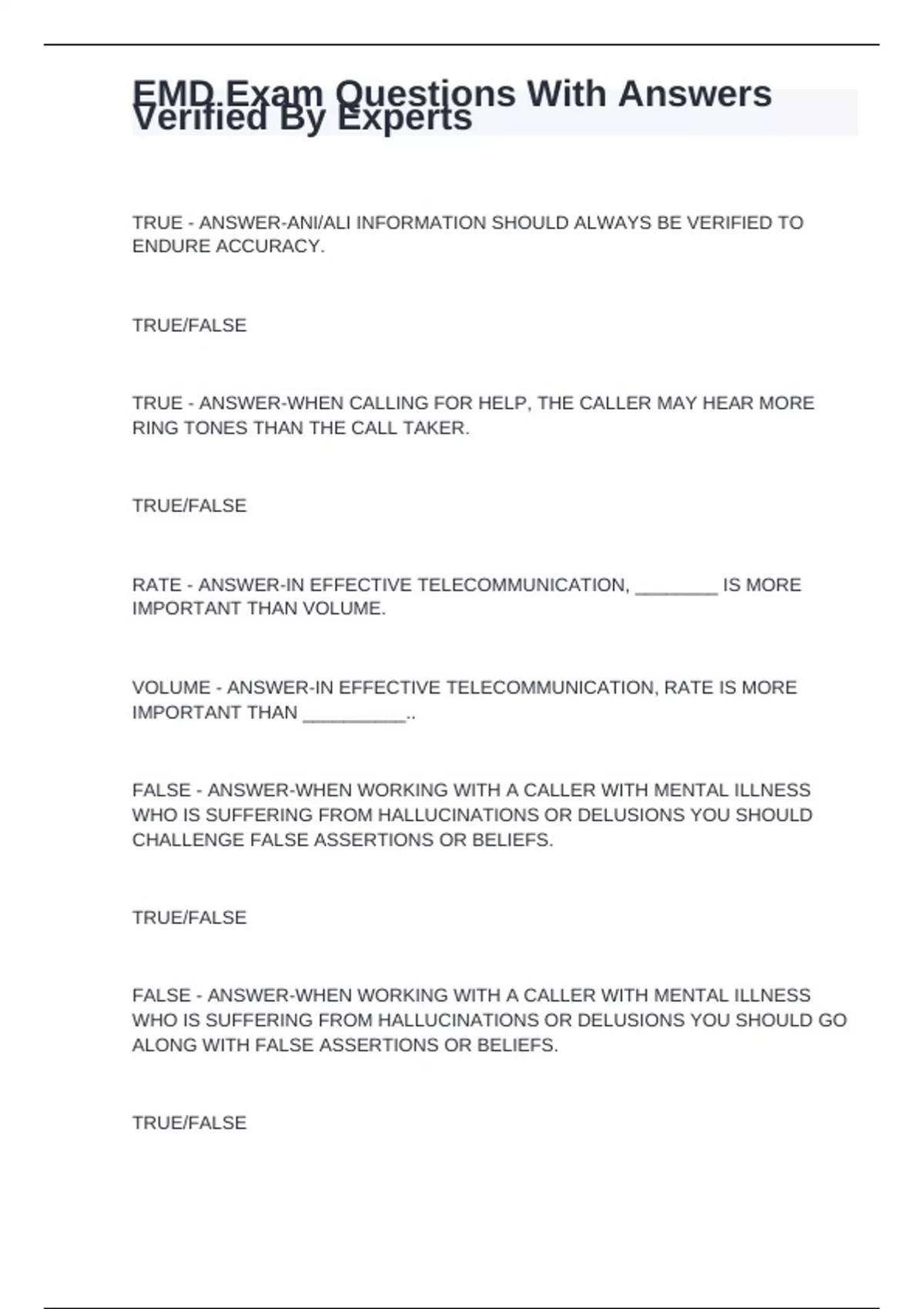 TRUE - ANSWER-ANI/ALI INFORMATION SHOULD ALWAYS BE VERIFIED TO ENDURE ACCURACY. TRUE/FALSE TRUE - ANSWER-WHEN CALLING FOR HELP, THE CALLER MAY HEAR MORE RING TONES THAN THE CALL TAKER. TRUE/FALSE RATE - ANSWER-IN EFFECTIVE TELECOMMUNICATION, ________ IS MORE IMPORTANT THAN VOLUME. VOLUME - ANSWER-IN EFFECTIVE TELECOMMUNICATION, RATE IS MORE IMPORTANT THAN __________.. FALSE - ANSWER-WHEN WORKING WITH A CALLER WITH MENTAL ILLNESS WHO IS SUFFERING FROM HALLUCINATIONS OR DELUSIONS YOU SHOULD CHALLENGE FALSE ASSERTIONS OR BELIEFS. TRUE/FALSE FALSE - ANSWER-WHEN WORKING WITH A CALLER WITH MENTAL ILLNESS WHO IS SUFFERING FROM HALLUCINATIONS OR DELUSIONS YOU SHOULD GO ALONG WITH FALSE ASSERTIONS OR BELIEFS. TRUE/FALSE