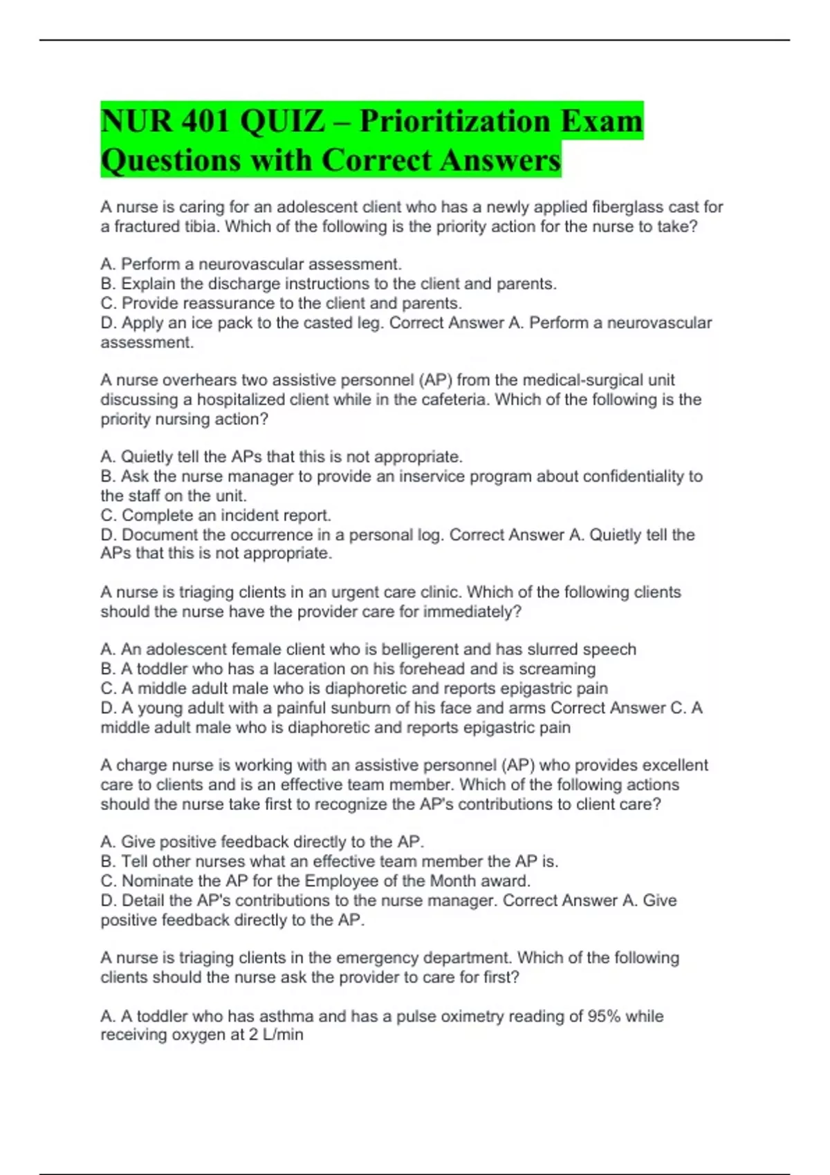 NUR 401 QUIZ – Prioritization Exam Questions with Correct Answers