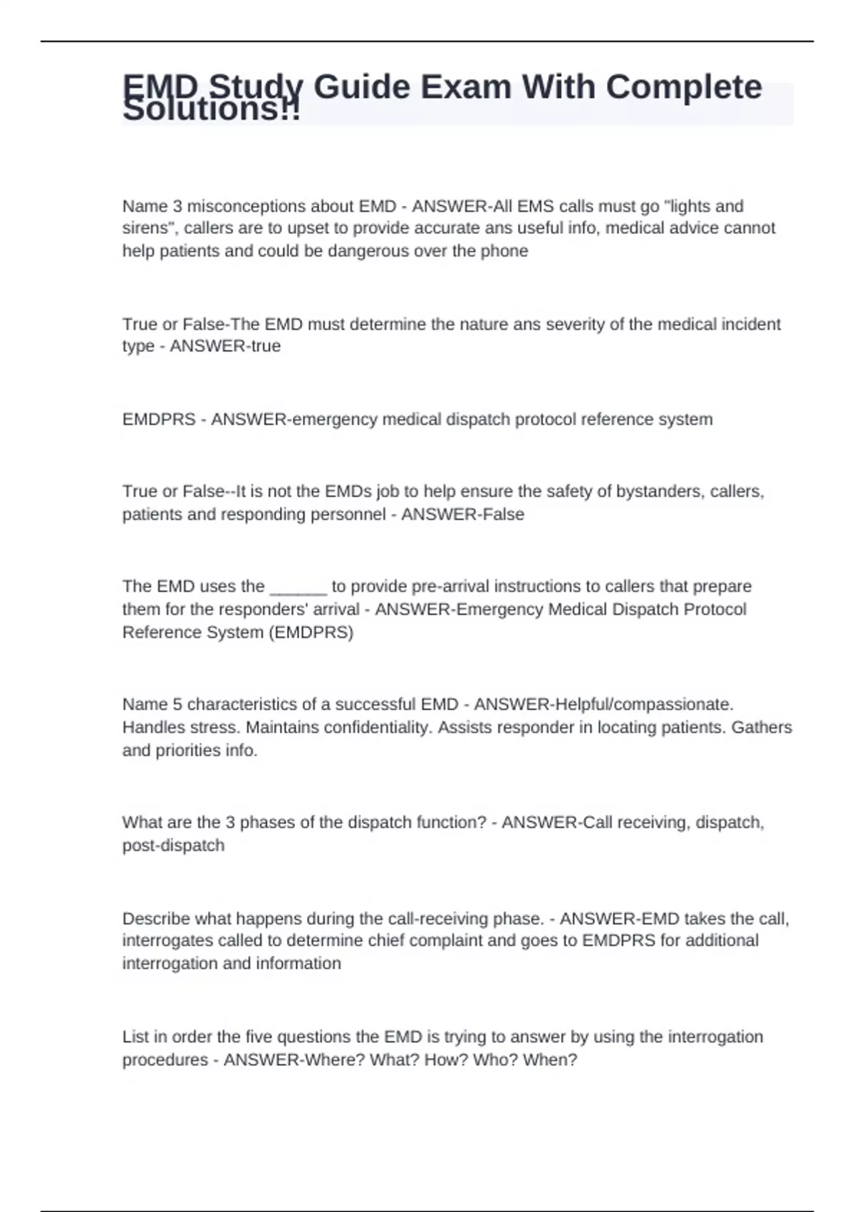 Name 3 misconceptions about EMD - ANSWER-All EMS calls must go "lights and sirens", callers are to upset to provide accurate ans useful info, medical advice cannot help patients and could be dangerous over the phone True or False-The EMD must determine the nature ans severity of the medical incident type - ANSWER-true EMDPRS - ANSWER-emergency medical dispatch protocol reference system True or False--It is not the EMDs job to help ensure the safety of bystanders, callers, patients and responding personnel - ANSWER-False The EMD uses the ______ to provide pre-arrival instructions to callers that prepare them for the responders' arrival - ANSWER-Emergency Medical Dispatch Protocol Reference System (EMDPRS) Name 5 characteristics of a successful EMD - ANSWER-Helpful/compassionate. Handles stress. Maintains confidentiality. Assists responder in locating patients. Gathers and priorities info. What are the 3 phases of the dispatch function? - ANSWER-Call receiving, dispatch, post-dispatch Describe what happens during the call-receiving phase. - ANSWER-EMD takes the call, interrogates called to determine chief complaint and goes to EMDPRS for additional interrogation and information List in order the five questions the EMD is trying to answer by using the interrogation procedures - ANSWER-Where? What? How? Who? When? Name 3 resources commonly found in most EMS systems. - ANSWER-BLS/ALS, fire, police What is a tiered system? - ANSWER-An EMS system with more than on level of response