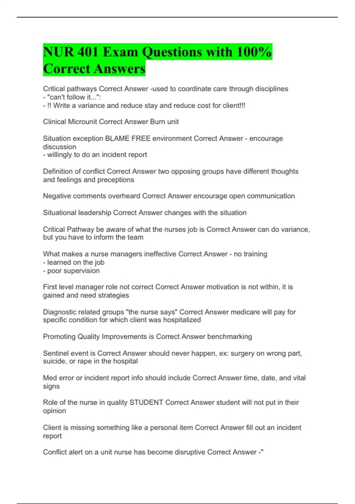 Critical pathways Correct Answer -used to coordinate care through disciplines - "can't follow it...": - !! Write a variance and reduce stay and reduce cost for client!!! Clinical Microunit Correct Answer Burn unit Situation exception BLAME FREE environment Correct Answer - encourage discussion - willingly to do an incident report Definition of conflict Correct Answer two opposing groups have different thoughts and feelings and preceptions Negative comments overheard Correct Answer encourage open communication Situational leadership Correct Answer changes with the situation Critical Pathway be aware of what the nurses job is Correct Answer can do variance, but you have to inform the team What makes a nurse managers ineffective Correct Answer - no training - learned on the job - poor supervision First level manager role not correct Correct Answer motivation is not within, it is gained and need strategies Diagnostic related groups "the nurse says" Correct Answer medicare will pay for specific condition for which client was hospitalized Promoting Quality Improvements is Correct Answer benchmarking Sentinel event is Correct Answer should never happen, ex: surgery on wrong part, suicide, or rape in the hospital Med error or incident report info should include Correct Answer time, date, and vital signs Role of the nurse in quality STUDENT Correct Answer student will not put in their opinion Client is missing something like a personal item Correct Answer fill out an incident report Conflict alert on a unit nurse has become disruptive Correct Answer -"