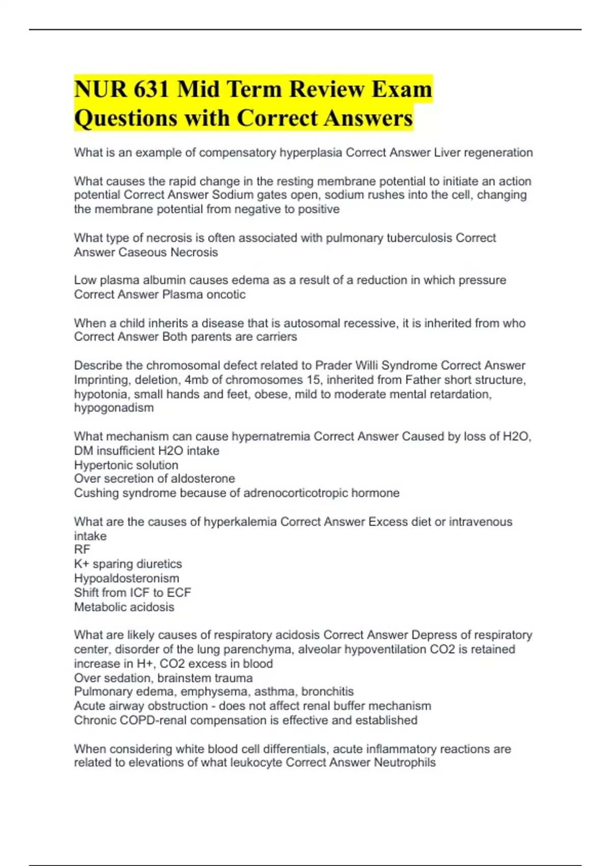 What is an example of compensatory hyperplasia Correct Answer Liver regeneration What causes the rapid change in the resting membrane potential to initiate an action potential Correct Answer Sodium gates open, sodium rushes into the cell, changing the membrane potential from negative to positive What type of necrosis is often associated with pulmonary tuberculosis Correct Answer Caseous Necrosis Low plasma albumin causes edema as a result of a reduction in which pressure Correct Answer Plasma oncotic When a child inherits a disease that is autosomal recessive, it is inherited from who Correct Answer Both parents are carriers Describe the chromosomal defect related to Prader Willi Syndrome Correct Answer Imprinting, deletion, 4mb of chromosomes 15, inherited from Father short structure, hypotonia, small hands and feet, obese, mild to moderate mental retardation, hypogonadism What mechanism can cause hypernatremia Correct Answer Caused by loss of H2O, DM insufficient H2O intake Hypertonic solution Over secretion of aldosterone Cushing syndrome because of adrenocorticotropic hormone What are the causes of hyperkalemia Correct Answer Excess diet or intravenous intake RF K+ sparing diuretics Hypoaldosteronism Shift from ICF to ECF Metabolic acidosis What are likely causes of respiratory acidosis Correct Answer Depress of respiratory center, disorder of the lung parenchyma, alveolar hypoventilation CO2 is retained increase in H+, CO2 excess in blood Over sedation, brainstem trauma Pulmonary edema, emphysema, asthma, bronchitis Acute airway obstruction - does not affect renal buffer mechanism Chronic COPD-renal compensation is effective and established When considering white blood cell differentials, acute inflammatory reactions are related to elevations of what leukocyte Correct Answer Neutrophils