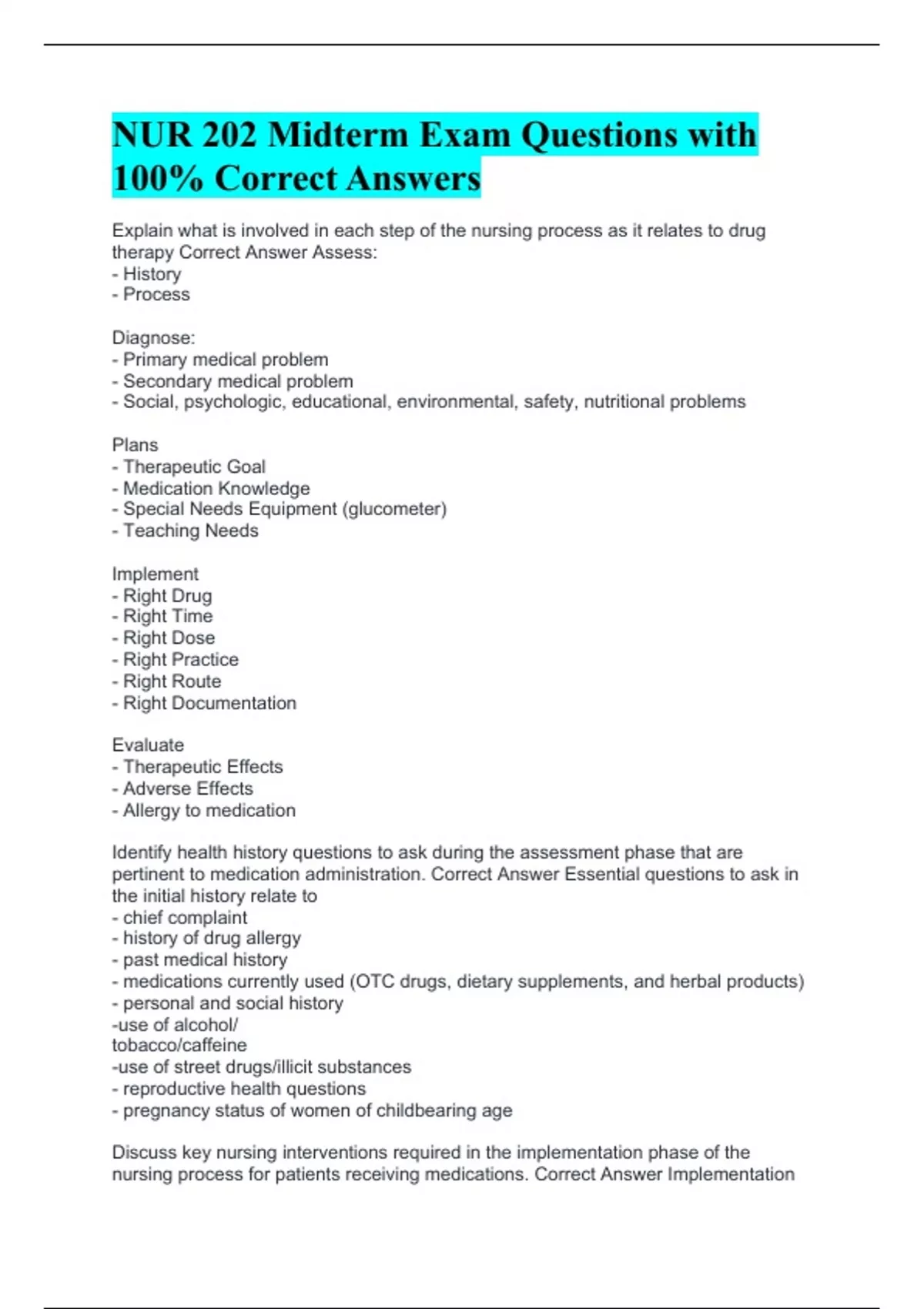 Explain what is involved in each step of the nursing process as it relates to drug therapy Correct Answer Assess: - History - Process Diagnose: - Primary medical problem - Secondary medical problem - Social, psychologic, educational, environmental, safety, nutritional problems Plans - Therapeutic Goal - Medication Knowledge - Special Needs Equipment (glucometer) - Teaching Needs Implement - Right Drug - Right Time - Right Dose - Right Practice - Right Route - Right Documentation Evaluate - Therapeutic Effects - Adverse Effects - Allergy to medication Identify health history questions to ask during the assessment phase that are pertinent to medication administration. Correct Answer Essential questions to ask in the initial history relate to - chief complaint - history of drug allergy - past medical history - medications currently used (OTC drugs, dietary supplements, and herbal products) - personal and social history -use of alcohol/ tobacco/caffeine -use of street drugs/illicit substances - reproductive health questions - pregnancy status of women of childbearing age Discuss key nursing interventions required in the implementation phase of the nursing process for patients receiving medications. Correct Answer Implementation
