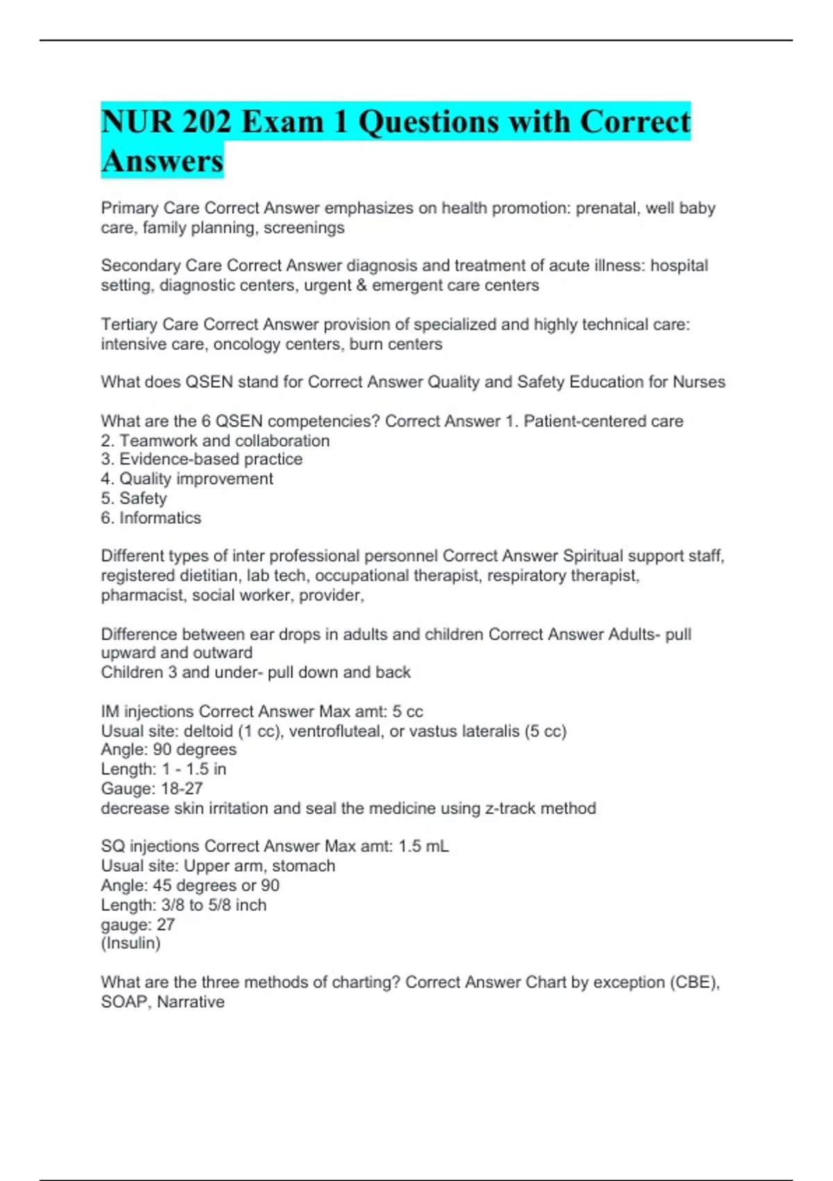 Primary Care Correct Answer emphasizes on health promotion: prenatal, well baby care, family planning, screenings Secondary Care Correct Answer diagnosis and treatment of acute illness: hospital setting, diagnostic centers, urgent & emergent care centers Tertiary Care Correct Answer provision of specialized and highly technical care: intensive care, oncology centers, burn centers What does QSEN stand for Correct Answer Quality and Safety Education for Nurses What are the 6 QSEN competencies? Correct Answer 1. Patient-centered care 2. Teamwork and collaboration 3. Evidence-based practice 4. Quality improvement 5. Safety 6. Informatics Different types of inter professional personnel Correct Answer Spiritual support staff, registered dietitian, lab tech, occupational therapist, respiratory therapist, pharmacist, social worker, provider, Difference between ear drops in adults and children Correct Answer Adults- pull upward and outward Children 3 and under- pull down and back IM injections Correct Answer Max amt: 5 cc Usual site: deltoid (1 cc), ventrofluteal, or vastus lateralis (5 cc) Angle: 90 degrees Length: 1 - 1.5 in Gauge: 18-27 decrease skin irritation and seal the medicine using z-track method
