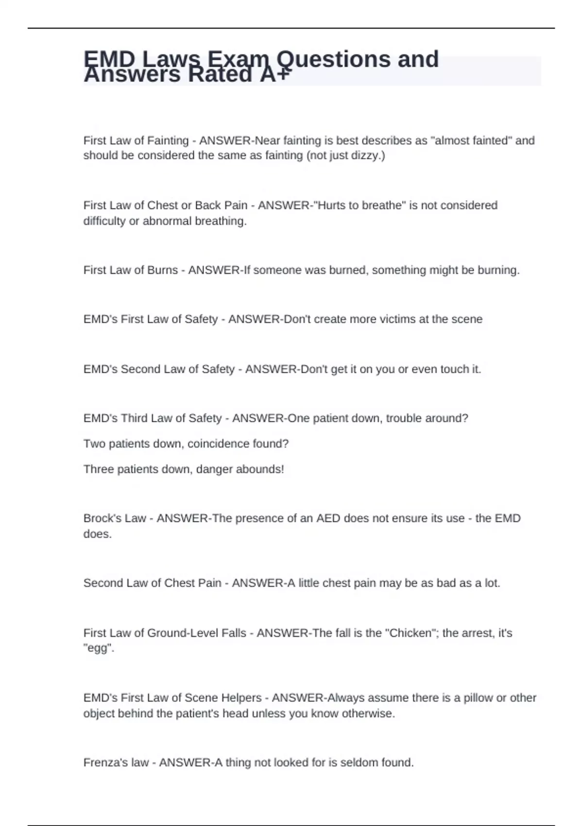 First Law of Fainting - ANSWER-Near fainting is best describes as "almost fainted" and should be considered the same as fainting (not just dizzy.) First Law of Chest or Back Pain - ANSWER-"Hurts to breathe" is not considered difficulty or abnormal breathing. First Law of Burns - ANSWER-If someone was burned, something might be burning. EMD's First Law of Safety - ANSWER-Don't create more victims at the scene EMD's Second Law of Safety - ANSWER-Don't get it on you or even touch it. EMD's Third Law of Safety - ANSWER-One patient down, trouble around? Two patients down, coincidence found? Three patients down, danger abounds! Brock's Law - ANSWER-The presence of an AED does not ensure its use - the EMD does. Second Law of Chest Pain - ANSWER-A little chest pain may be as bad as a lot. First Law of Ground-Level Falls - ANSWER-The fall is the "Chicken"; the arrest, it's "egg". EMD's First Law of Scene Helpers - ANSWER-Always assume there is a pillow or other object behind the patient's head unless you know otherwise. Frenza's law - ANSWER-A thing not looked for is seldom found. De Luca's law - ANSWER-EMD's will follow all protocols per se, avoiding freelance questioning or information unless it enhances, not replaces, the written protocol questions and script's. Law of Concurrent Priorities - ANSWER-The EMD must outweigh the concurrent priorities of obtaining (and verifying) a useful location, helping the caller get to safety, and caring for the patient. First Law of Medical Dispatch - ANSWER-First, do no harm. Second Law of Medical Dispatch - ANSWER-When in doubt, send them out. (always err in the direction of patient safety)