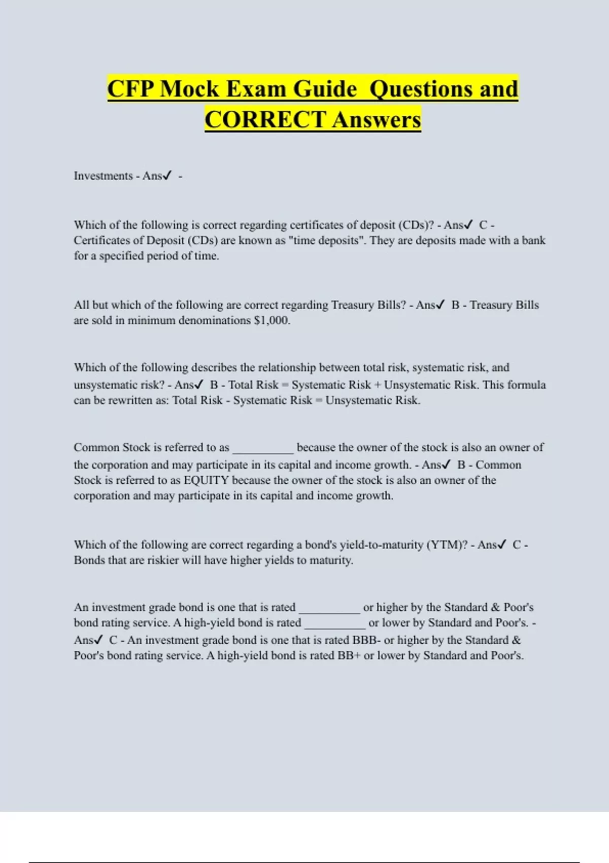 CFP Mock Exam Guide Questions and CORRECT Answers Investments - Ans - Which of the following is correct regarding certificates of deposit (CDs)? - Ans C - Certificates of Deposit (CDs) are known as "time deposits". They are deposits made with a bank for a specified period of time. All but which of the following are correct re