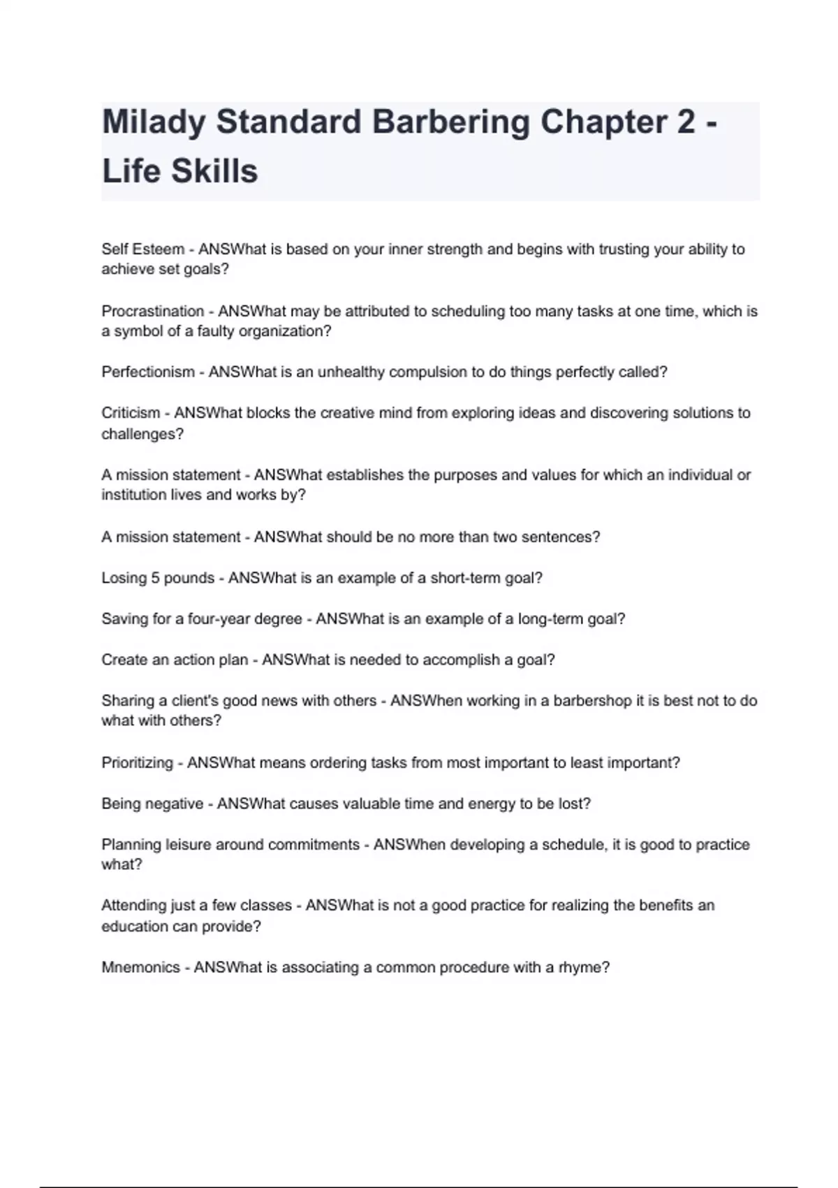 Milady Standard Barbering Chapter 2 - Life Skills questions and answers graded A+ by experts 2024/2025