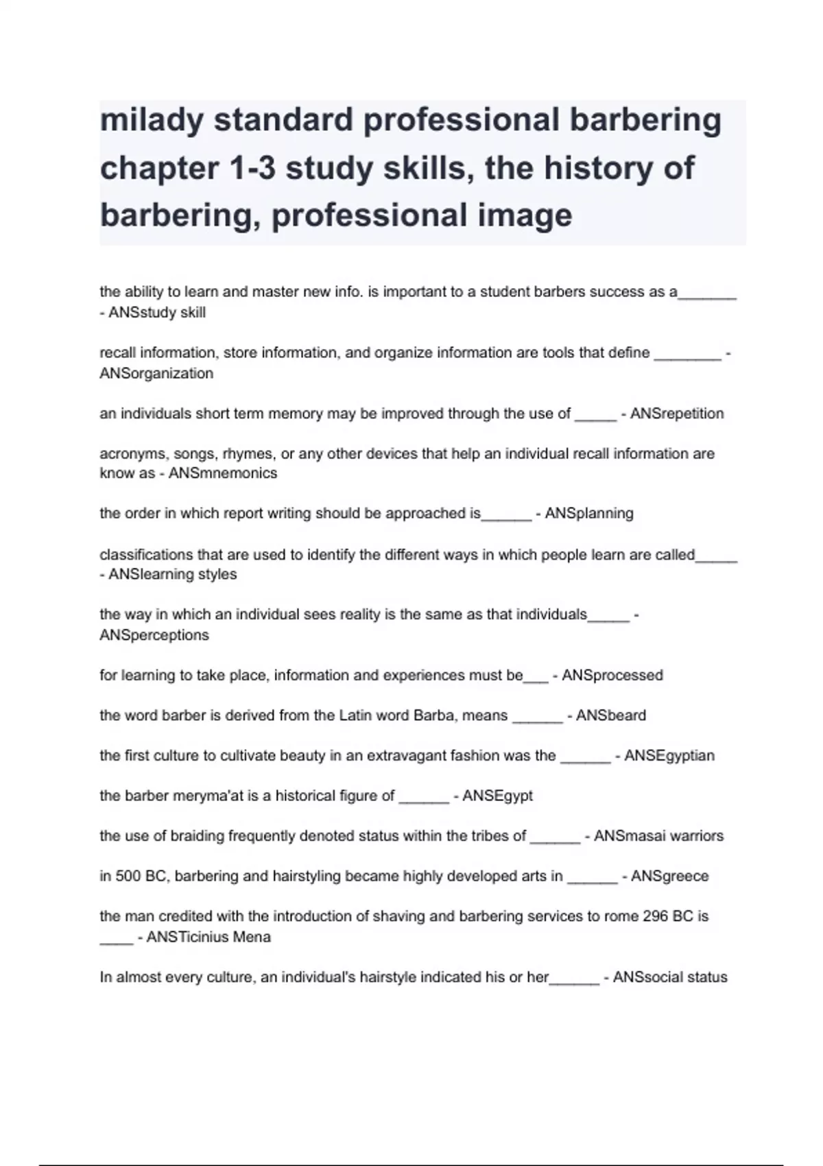 milady standard professional barbering chapter 1-3 study skills, the history of barbering, professional image questions and answers graded A+ by experts 2024/2025