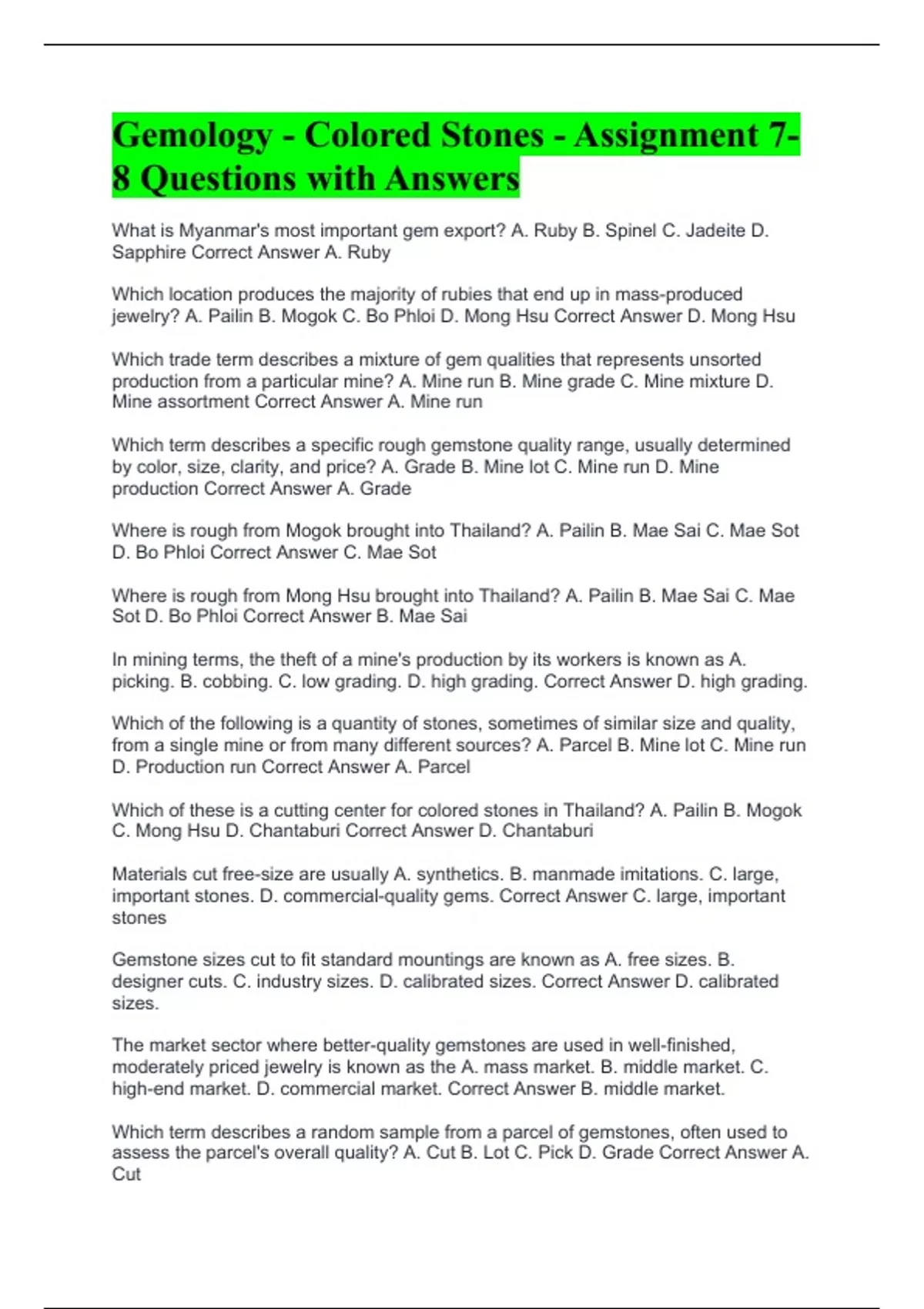 What is Myanmar's most important gem export? A. Ruby B. Spinel C. Jadeite D. Sapphire Correct Answer A. Ruby Which location produces the majority of rubies that end up in mass-produced jewelry? A. Pailin B. Mogok C. Bo Phloi D. Mong Hsu Correct Answer D. Mong Hsu Which trade term describes a mixture of gem qualities that represents unsorted production from a particular mine? A. Mine run B. Mine grade C. Mine mixture D. Mine assortment Correct Answer A. Mine run Which term describes a specific rough gemstone quality range, usually determined by color, size, clarity, and price? A. Grade B. Mine lot C. Mine run D. Mine production Correct Answer A. Grade Where is rough from Mogok brought into Thailand? A. Pailin B. Mae Sai C. Mae Sot D. Bo Phloi Correct Answer C. Mae Sot Where is rough from Mong Hsu brought into Thailand? A. Pailin B. Mae Sai C. Mae Sot D. Bo Phloi Correct Answer B. Mae Sai In mining terms, the theft of a mine's production by its workers is known as A. picking. B. cobbing. C. low grading. D. high grading. Correct Answer D. high grading. Which of the following is a quantity of stones, sometimes of similar size and quality, from a single mine or from many different sources? A. Parcel B. Mine lot C. Mine run D. Production run Correct Answer A. Parcel Which of these is a cutting center for colored stones in Thailand? A. Pailin B. Mogok C. Mong Hsu D. Chantaburi Correct Answer D. Chantaburi Materials cut free-size are usually A. synthetics. B. manmade imitations. C. large, important stones. D. commercial-quality gems. Correct Answer C. large, important stones Gemstone sizes cut to fit standard mountings are known as A. free sizes. B. designer cuts. C. industry sizes. D. calibrated sizes. Correct Answer D. calibrated sizes.