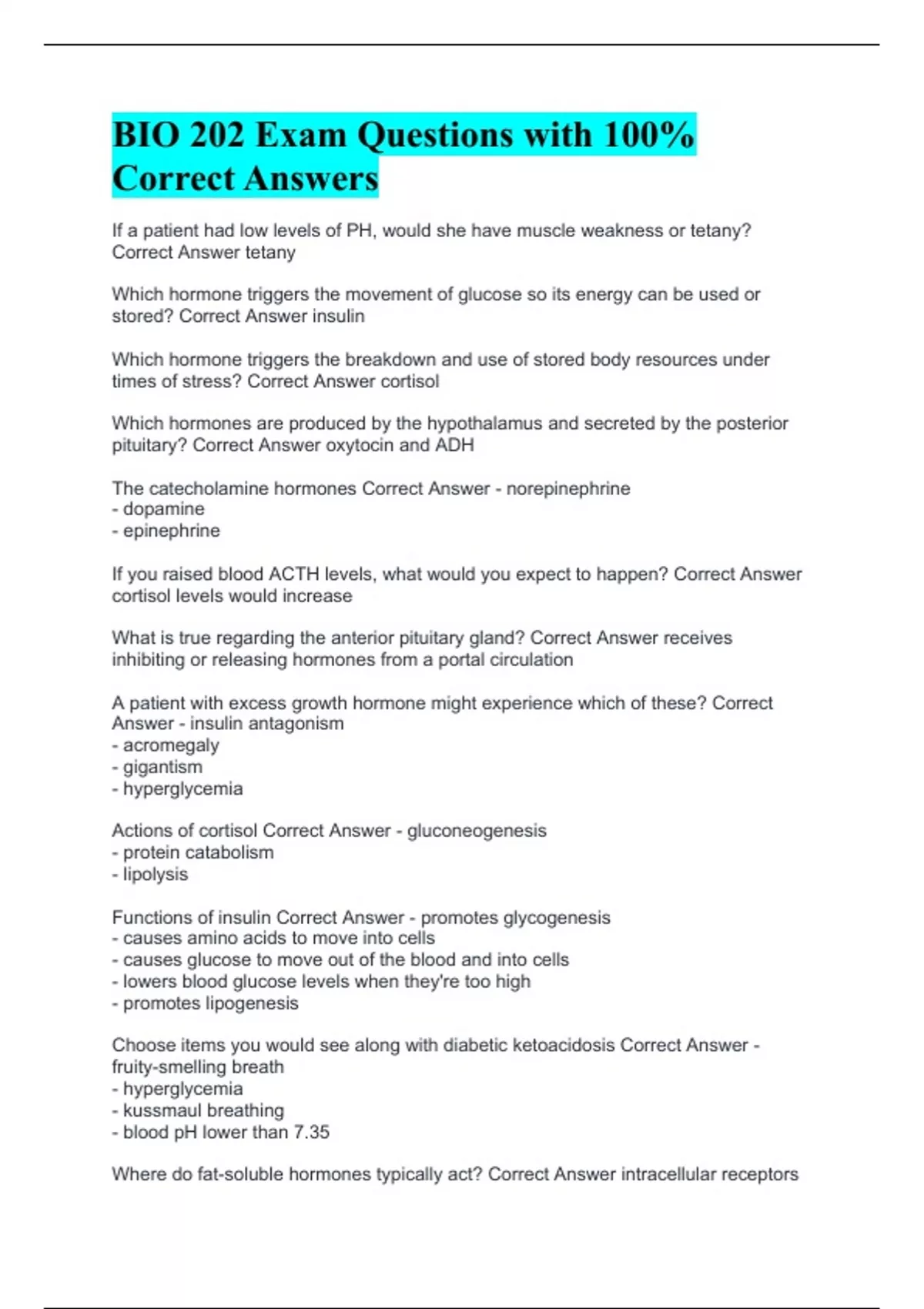 BIO 202 Exam Questions with 100% Correct Answers