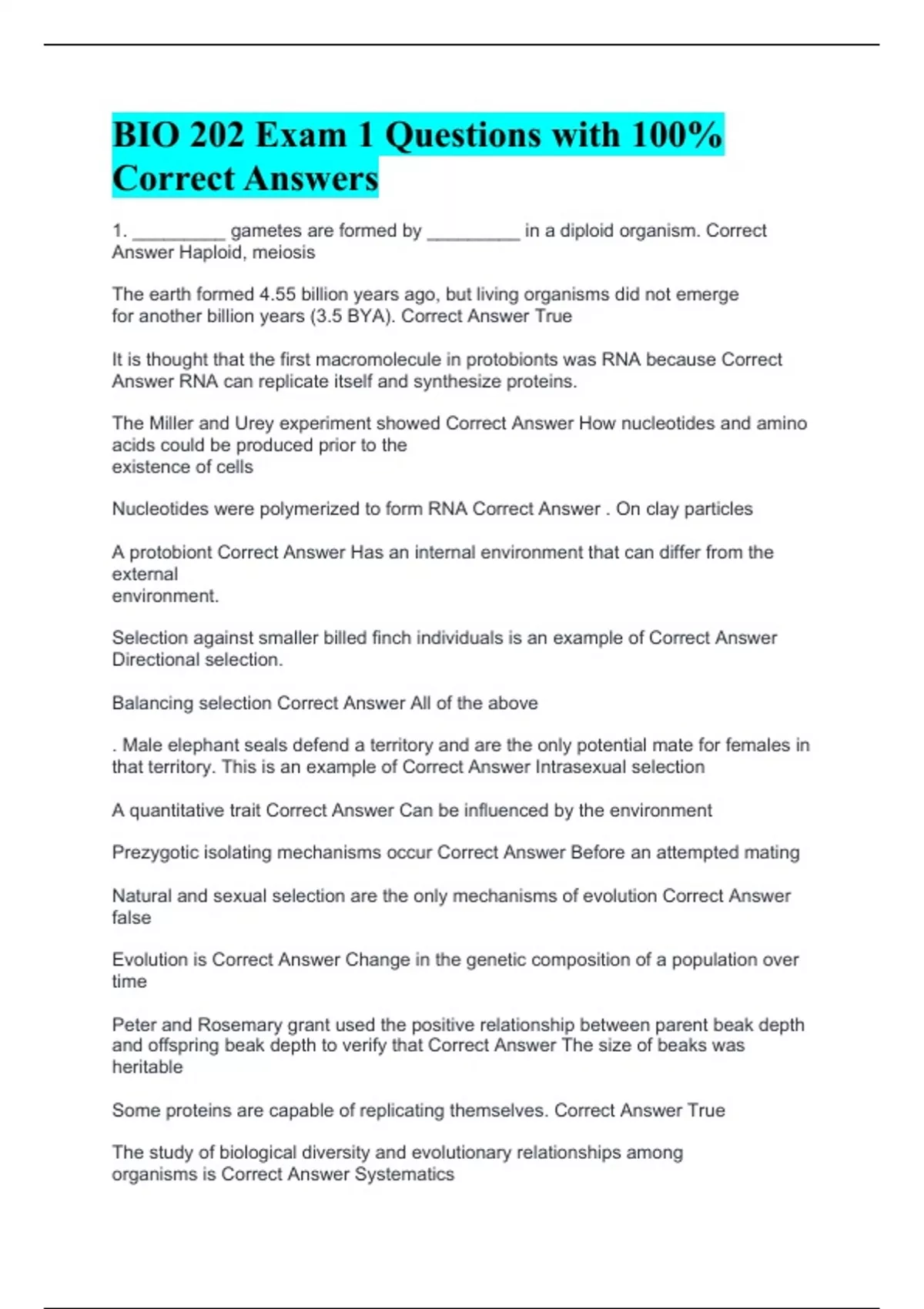 1. _________ gametes are formed by _________ in a diploid organism. Correct Answer Haploid, meiosis The earth formed 4.55 billion years ago, but living organisms did not emerge for another billion years (3.5 BYA). Correct Answer True It is thought that the first macromolecule in protobionts was RNA because Correct Answer RNA can replicate itself and synthesize proteins. The Miller and Urey experiment showed Correct Answer How nucleotides and amino acids could be produced prior to the existence of cells Nucleotides were polymerized to form RNA Correct Answer . On clay particles A protobiont Correct Answer Has an internal environment that can differ from the external environment. Selection against smaller billed finch individuals is an example of Correct Answer Directional selection. Balancing selection Correct Answer All of the above . Male elephant seals defend a territory and are the only potential mate for females in that territory. This is an example of Correct Answer Intrasexual selection A quantitative trait Correct Answer Can be influenced by the environment Prezygotic isolating mechanisms occur Correct Answer Before an attempted mating Natural and sexual selection are the only mechanisms of evolution Correct Answer false Evolution is Correct Answer Change in the genetic composition of a population over time Peter and Rosemary grant used the positive relationship between parent beak depth and offspring beak depth to verify that Correct Answer The size of beaks was heritable Some proteins are capable of replicating themselves. Correct Answer True The study of biological diversity and evolutionary relationships among organisms is Correct Answer Systematics