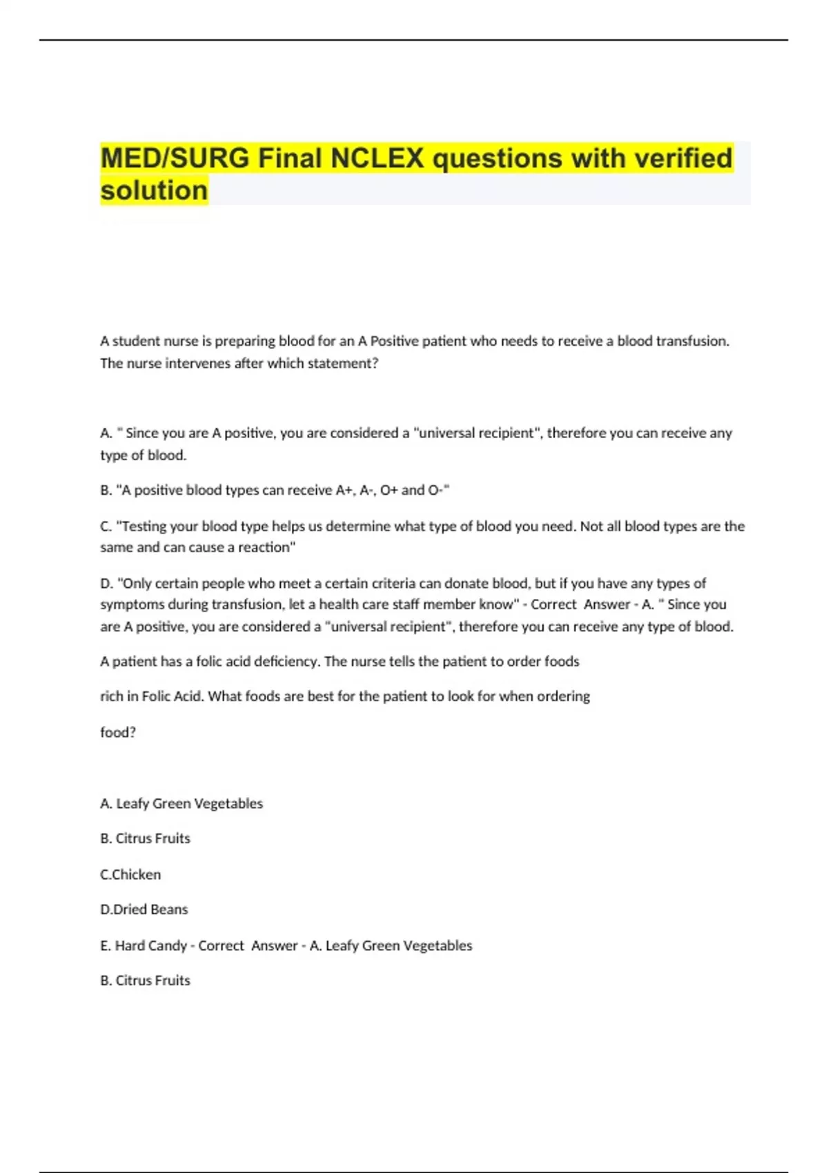 MED/SURG Final NCLEX questions with verified solution