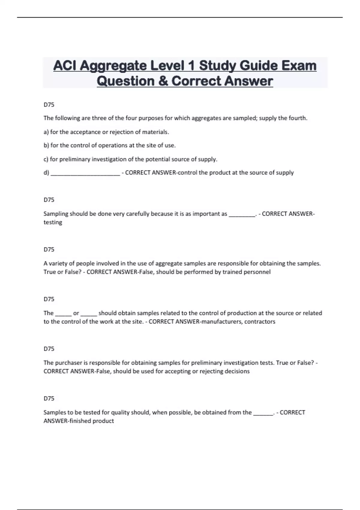 ACI Aggregate Level 1 Study Guide Exam Question & Correct Answer D75 The following are three of the four purposes for which aggregates are sampled; supply the fourth. a) for the acceptance or rejection of materials. b) for the control of operations at the site of use. c) for preliminary investigation of the potential source of supply. d) _____________________ - CORRECT ANSWER-control the product at the source of suppl