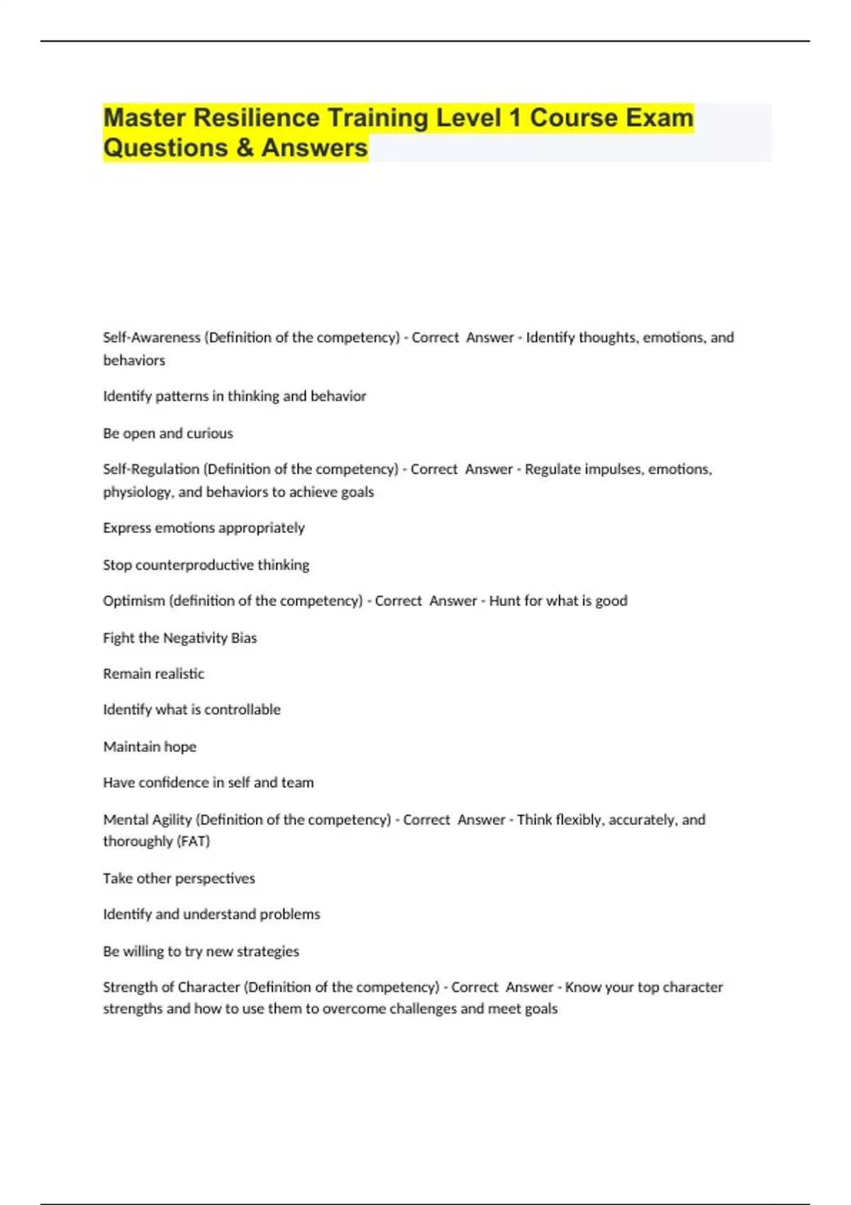 Master Resilience Training Level 1 Course Exam Questions & Answers.