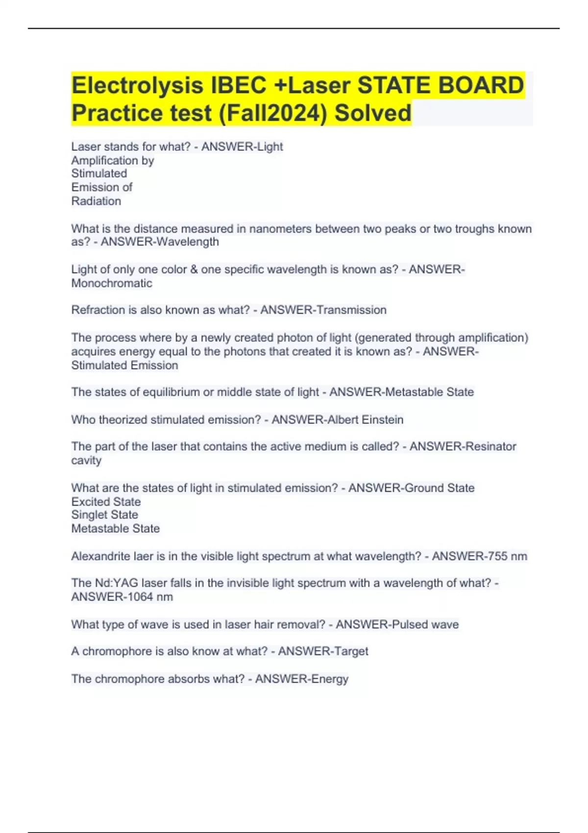 Laser stands for what? - ANSWER-Light Amplification by Stimulated Emission of Radiation What is the distance measured in nanometers between two peaks or two troughs known as? - ANSWER-Wavelength Light of only one color & one specific wavelength is known as? - ANSWER-Monochromatic Refraction is also known as what? - ANSWER-Transmission The process where by a newly created photon of light (generated through amplification) acquires energy equal to the photons that created it is known as? - ANSWER-Stimulated Emission The states of equilibrium or middle state of light - ANSWER-Metastable State Who theorized stimulated emission? - ANSWER-Albert Einstein